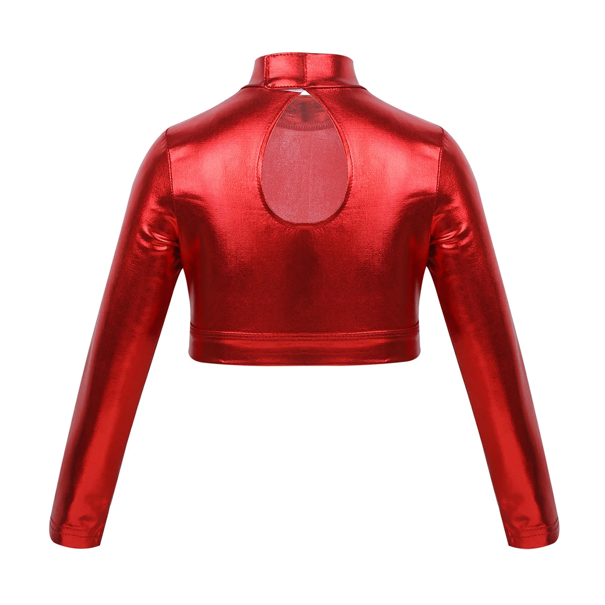 Блестящий кроп-топ с металлическим блеском, детские футболки с длинными рукавами для девочек, Короткие укороченные топы с ложным воротником, тренировочные сценические представления