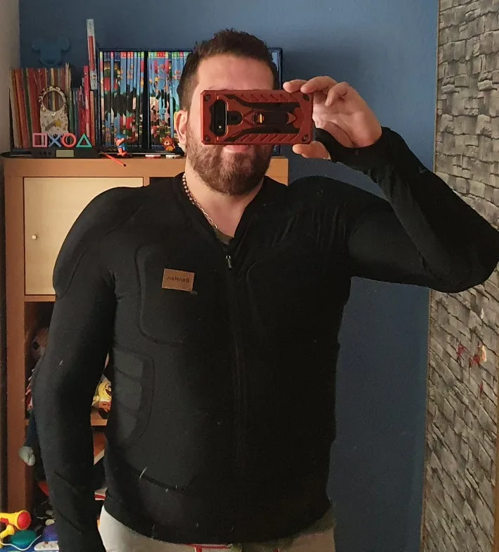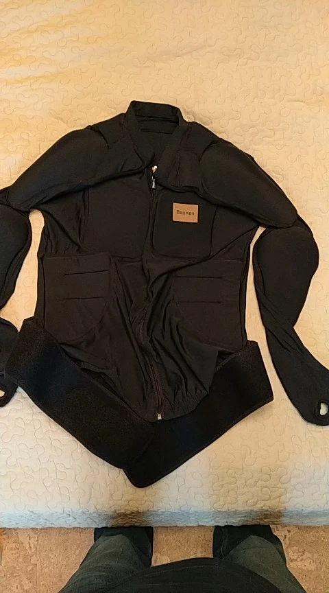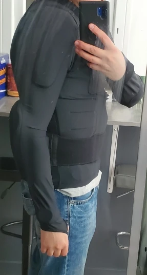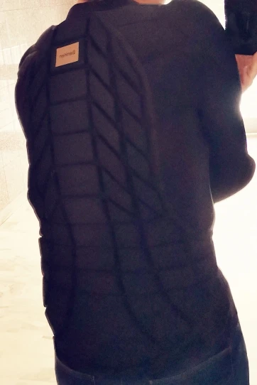 Качество хорошее, защита спины на первый взгляд выглядит надежно, мой рост 185, вес 85, продавец посоветовал размер XXL, на голое тело чуть чуть подвисает, надо либо термуху подъодеть, либо подкачаться (будет чем до зимы заняться). А в целом хорошая вещь.