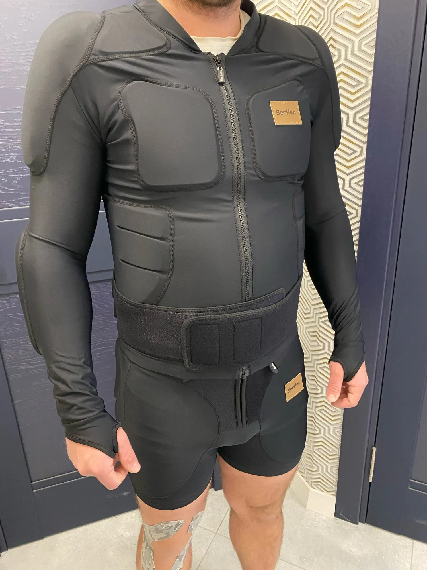 Качество супер, материал приятный. Брал комплектом. Все продумано до мелочей, и сшито четко, везде есть резинки так что под свой размер можно идеально подогнать. На рост 170 вес 67 размер L сел идеально, даже есть немного запаса. В движении вообще не ощущается, что на теле есть какая-то защита. Из за праздников шли почти месяц. Однозначно советую к покупке.