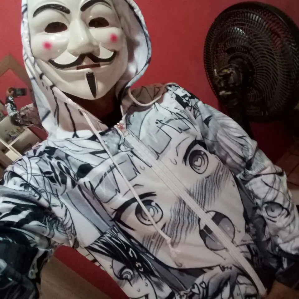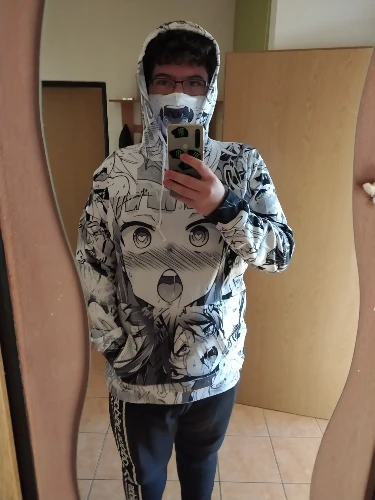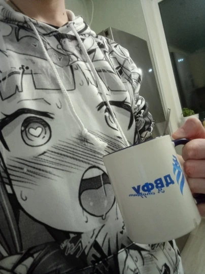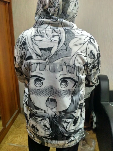 Мой идиот парень заказал эту толстовку. Большая, можно надевать на другие кофты. Принт цикличный - повторяется на рукавах, спине и капюшоне. Очень колит, если надеть на голое тело, немного воняла!