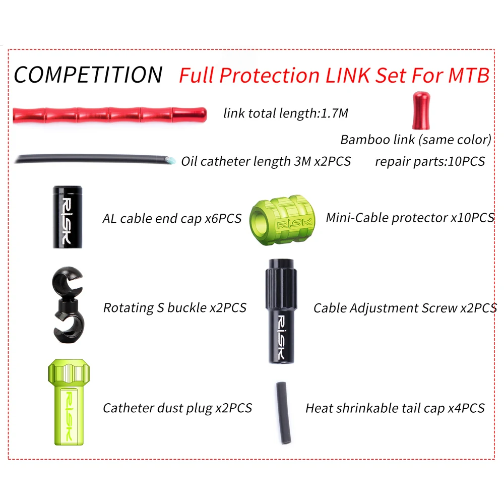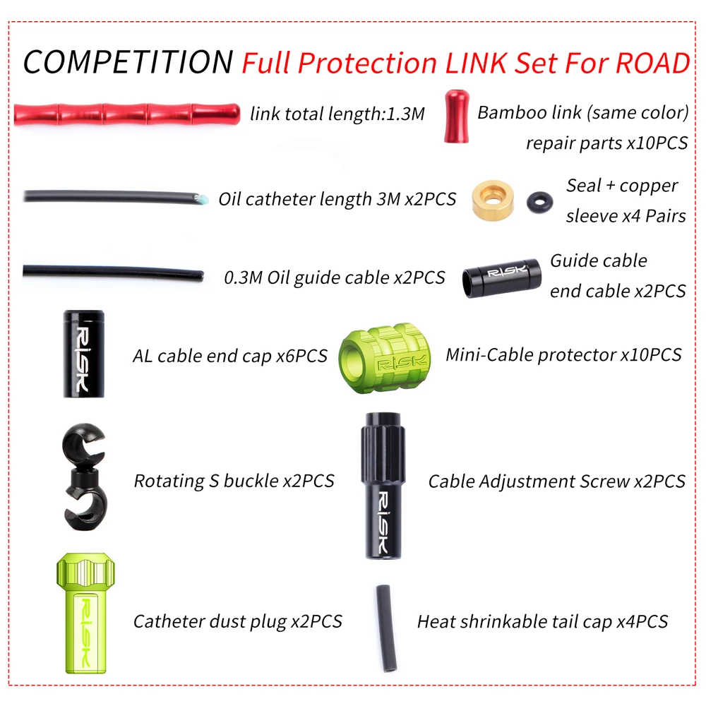 Комплект звеньев для горного велосипеда комплектация: 1x1700 мм соединительный кабель Запасные части для ремонта 10x 2x3 м масляный катетер Наконечник кабеля 6x AL 10x мини-протектор кабеля 2x вращающаяся S-образная пряжка 2x регулировочный винт для кабеля 2 шт. Пылезащитная пробка для катетера 4 шт. термоусадочная задняя крышка -------------------------------------- Комплект шоссейного велосипеда комплектация: Соединительный кабель 1,3 м-1 шт. Запасные части для ремонта 10x 2x3 м масляный катетер 4x уплотнение + медная втулка 2x0,3 м масляный направляющий кабель 2x направляющий кабель Наконечник кабеля 6x AL 10x мини-протектор кабеля 2x вращающаяся S-образная пряжка 2x регулировочный винт для кабеля 2 шт. Пылезащитная пробка для катетера 4 шт. термоусадочная задняя крышка