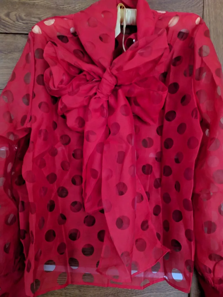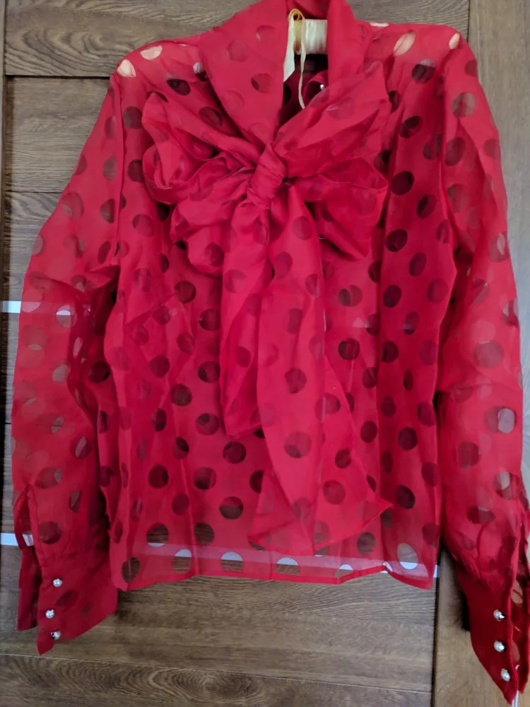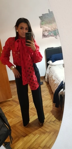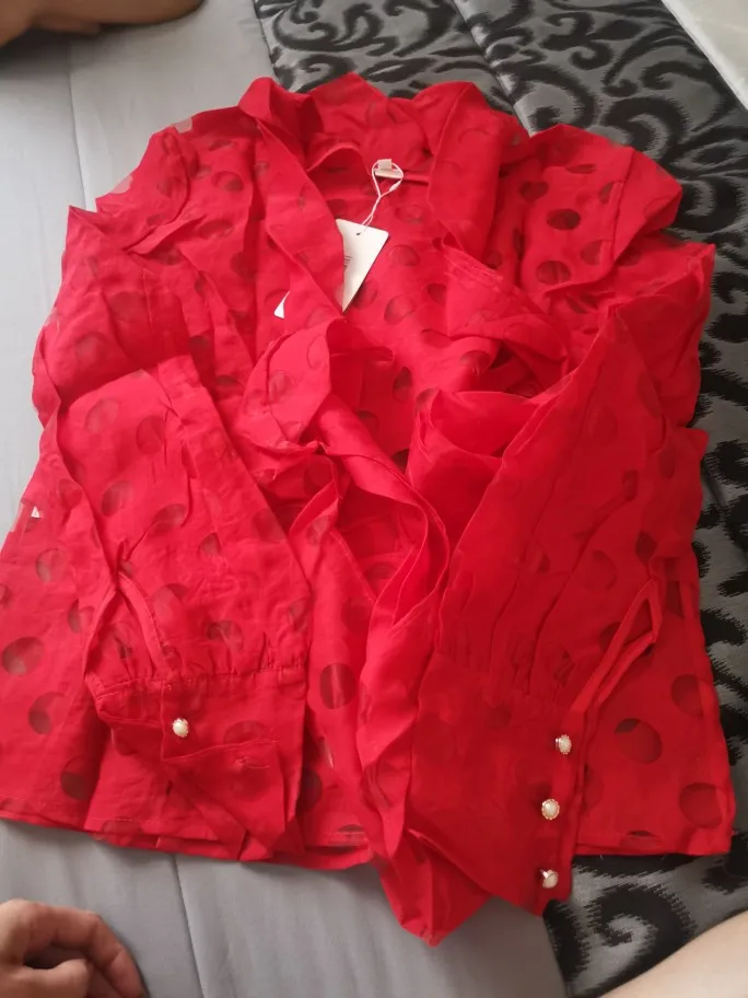 Он точно соответствует фотографиям продавца, он красивый! Ткань очень мягкая органза, размеры идеально сочетаются, цвет красивый ярко-красный, я очень доволен этой покупкой, я абсолютно рекомендую эту красивую блузку, хорошее качество.