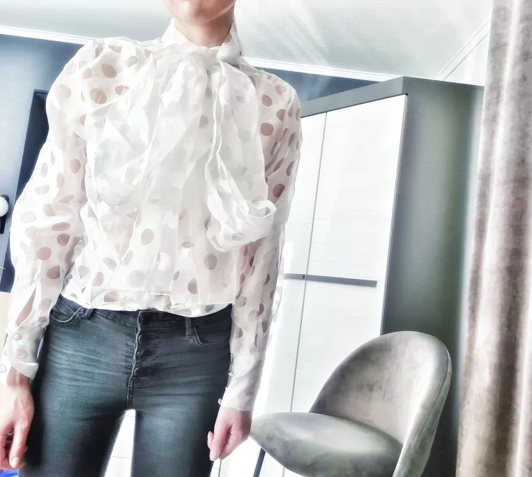 Спасибо продавцу за качественный товар и быструю доставку-9дней всего!!! Блуза в точности как на картинке! На рост 178см, вес около 68кг, в самый раз размер М!Полная длина рукава,конечно под неё нужен белый топ.(просвечивает).Красиво завязаный бант смотрится нереально круто! Классная блузка,создаёт нежный, женственный образ!