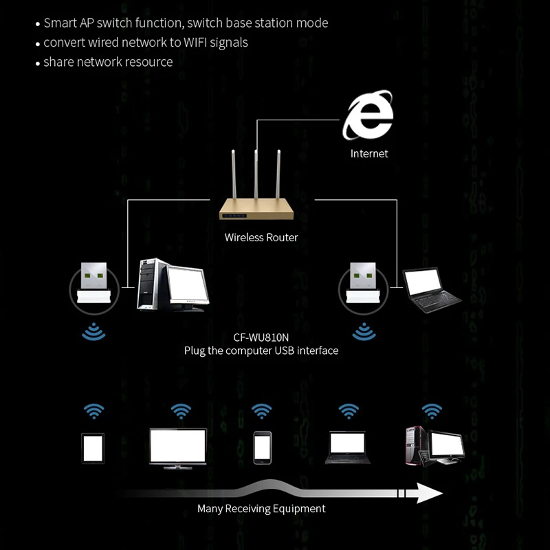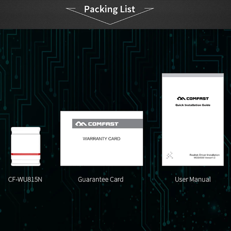 CF-WU810N: Скорость передачи: 300 Мбит/с Тип интерфейса: USB Стандарт беспроводной связи: IEEE 802.11b, IEEE 802,11g, IEEE 802.11n Диапазон рабочих частот: 2,4G Поддержка: 802.11n CF-WU815N: Скорость передачи: 150 Мбит/с Тип интерфейса: USB Стандарт беспроводной связи: IEEE 802.11n Диапазон рабочих частот: 2,4G Поддержка: 802.11ac Посылка: Мини Сетевая карта * 1 Руководство по эксплуатации * 1