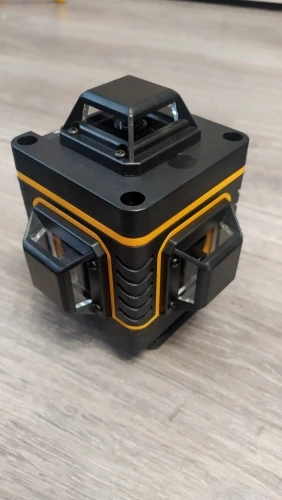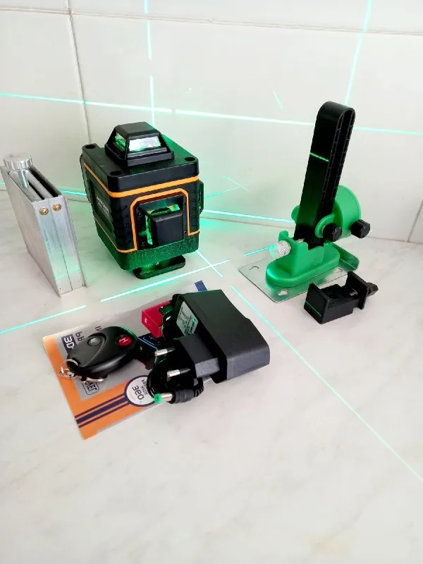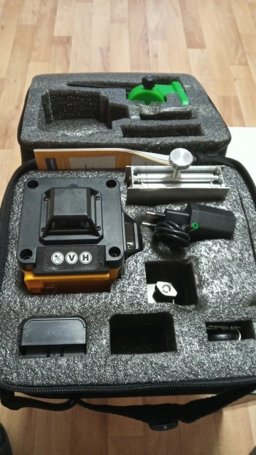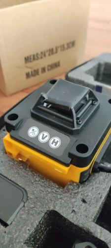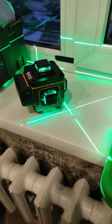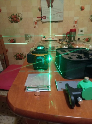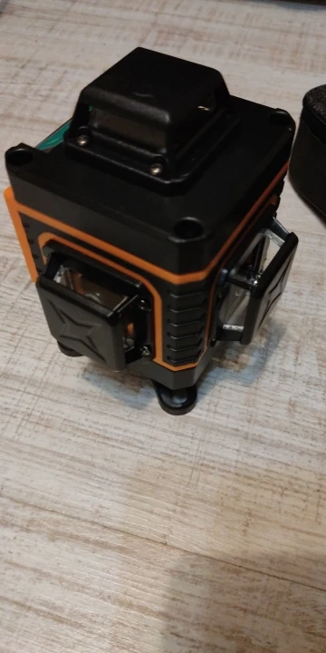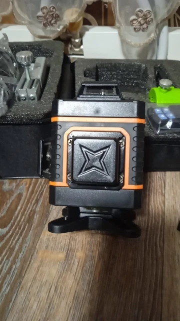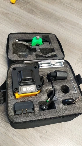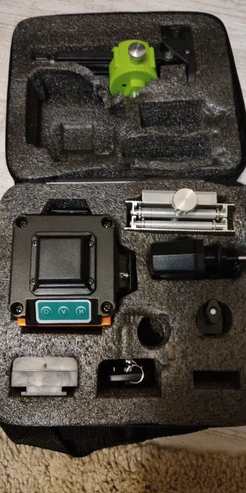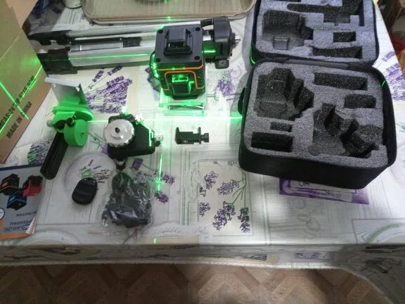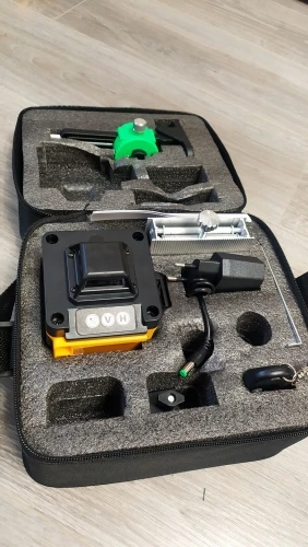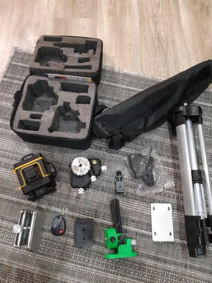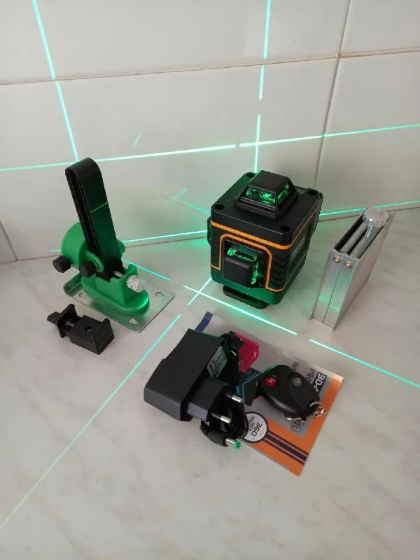 Покупал из раздела экспресс- доставка, выбор комплектации- Orange. Важна была невысокая стоимость, не частое использование. Главное, что волновало- действительно ли в нём 4D (не на одном фото не видно четвёртой точки лазера) И думал, что точки будет три (12 линий). И о чудо, прибор и правда с четырьмя точками. Хотелось бы иметь максимум, раз такое предлагают. При распаковке все оказалось на месте: оссепостроитель, литиевая батарея, зарядка к ней, мануал на английском, платформа с возможностью изменения высоты, кронштейн 360 градусов для крепления к стене с магнитами (магниты очень мощные) и отдельно пластина для крепления к стене. А, ещё крепёж с захватом прибора снизу (показался не слишком прочным) с выводом на винт для крепления к кронштейну ли штативу и пульт. Всё это в тряпочном боксе, в котором имеется поролоновая форма для всех частей. Бокс на молнии с ручкой. В общем упаковка, комплектация, эргономика бокса- всё сделано с умом и качественно, относительно его стоимости.