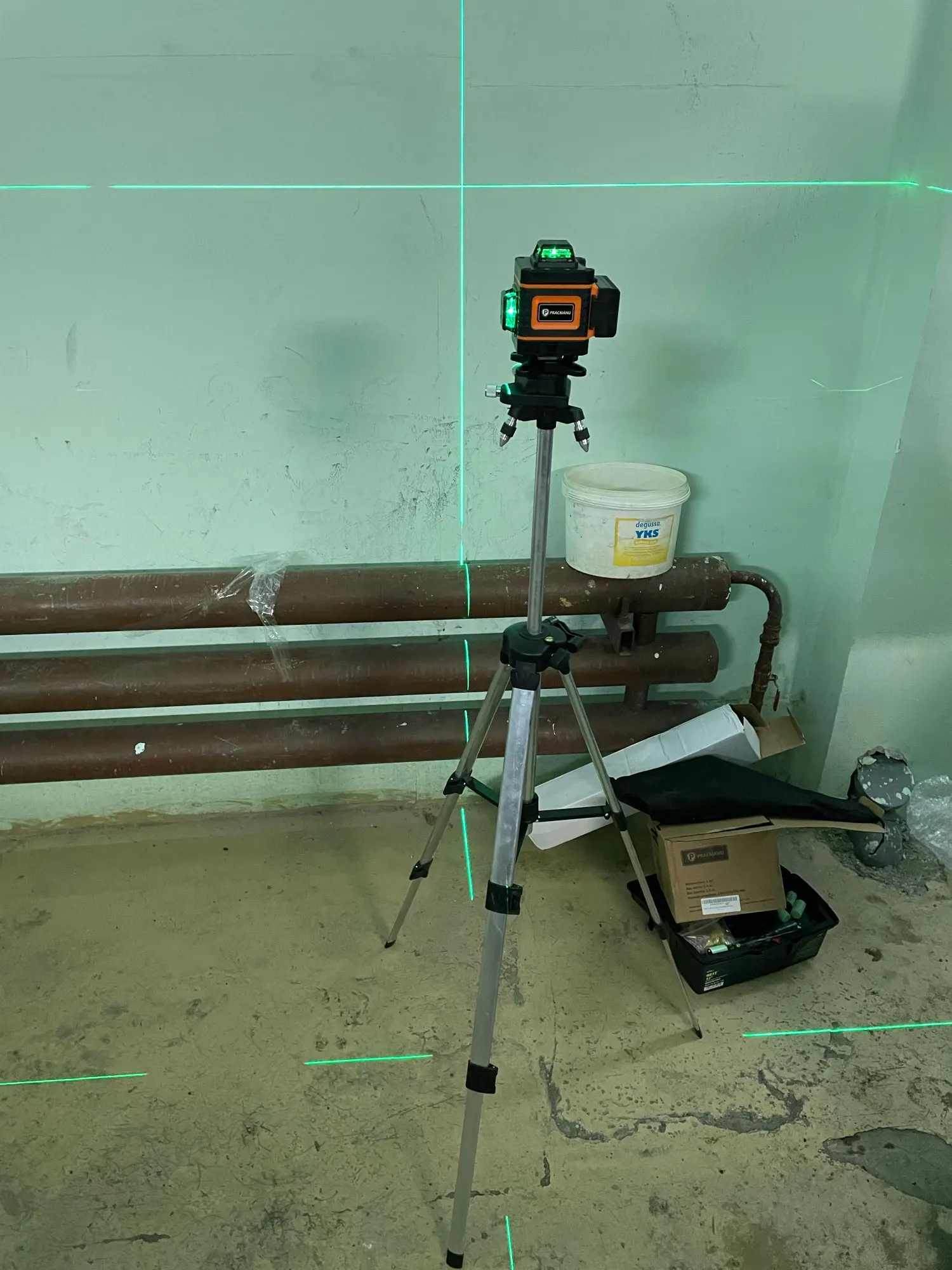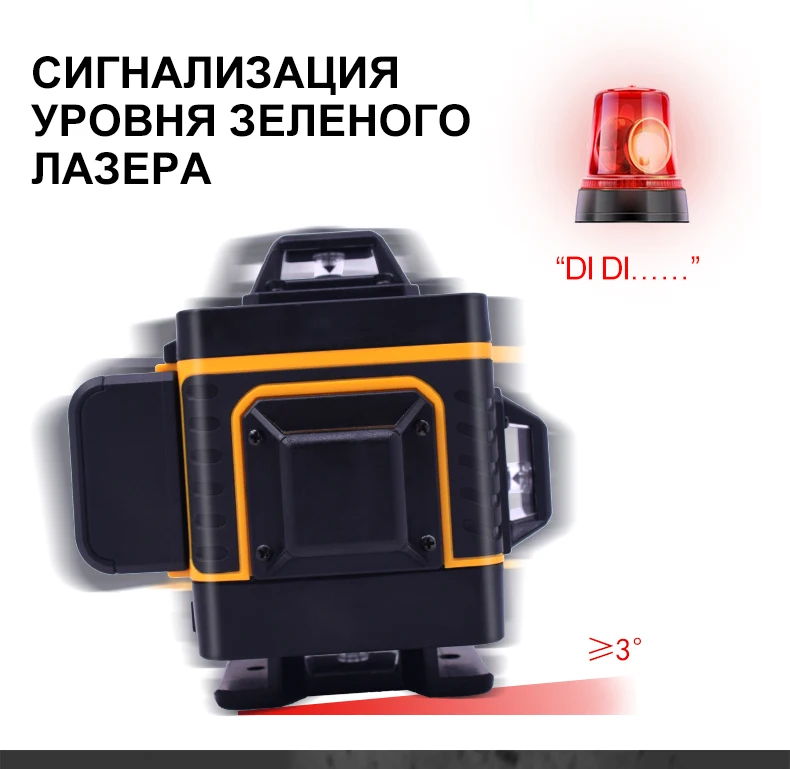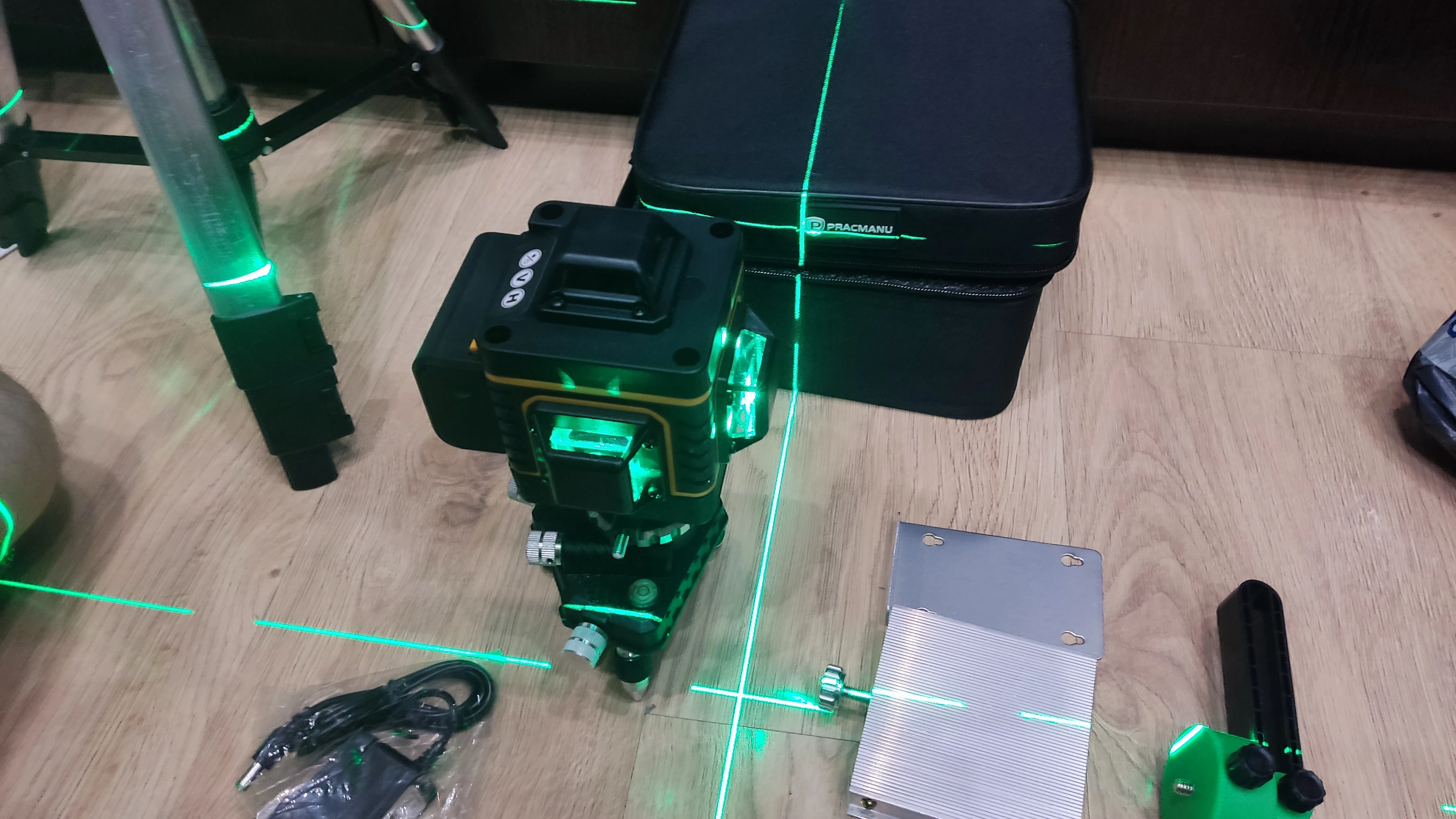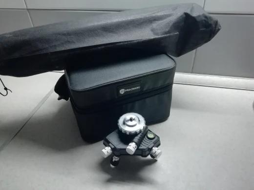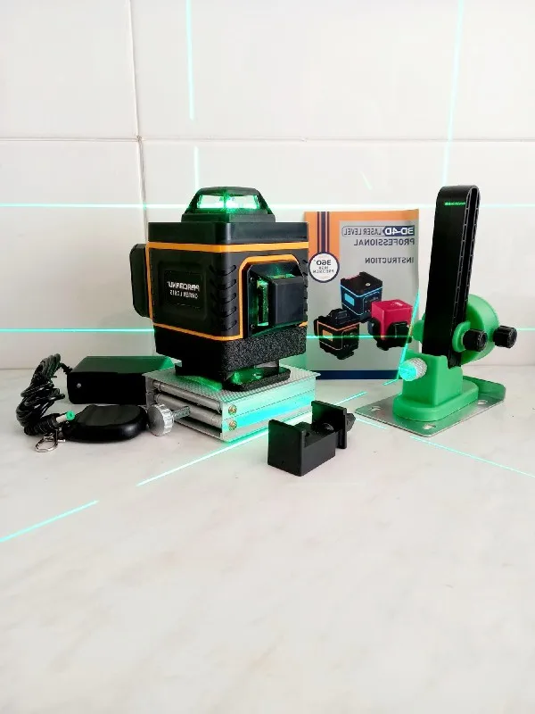 Покупал из раздела экспресс- доставка, выбор комплектации- Orange. Важна была невысокая стоимость, не частое использование. Главное, что волновало- действительно ли в нём 4D (не на одном фото не видно четвёртой точки лазера) И думал, что точки будет три (12 линий). И о чудо, прибор и правда с четырьмя точками. Хотелось бы иметь максимум, раз такое предлагают. При распаковке все оказалось на месте: оссепостроитель, литиевая батарея, зарядка к ней, мануал на английском, платформа с возможностью изменения высоты, кронштейн 360 градусов для крепления к стене с магнитами (магниты очень мощные) и отдельно пластина для крепления к стене. А, ещё крепёж с захватом прибора снизу (показался не слишком прочным) с выводом на винт для крепления к кронштейну ли штативу и пульт. Всё это в тряпочном боксе, в котором имеется поролоновая форма для всех частей. Бокс на молнии с ручкой. В общем упаковка, комплектация, эргономика бокса- всё сделано с умом и качественно, относительно его стоимости.