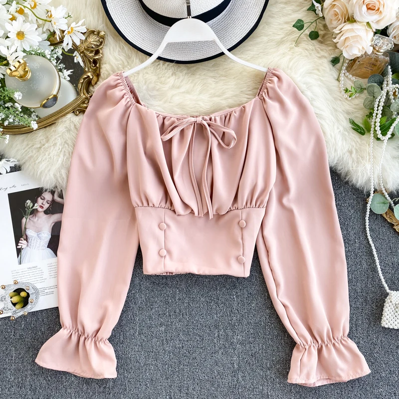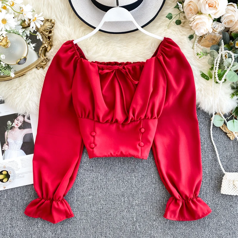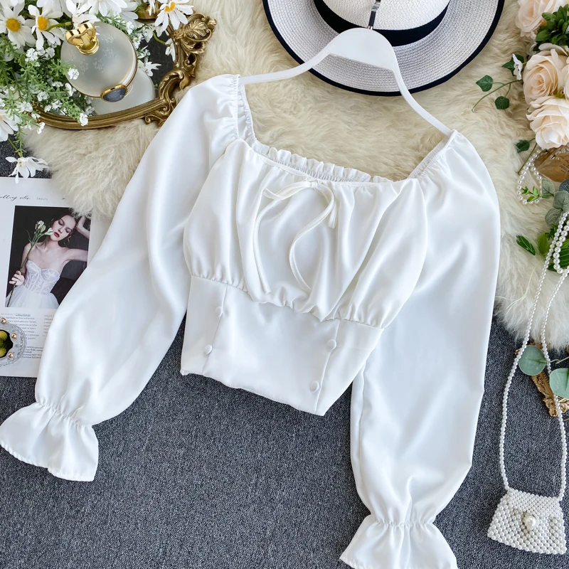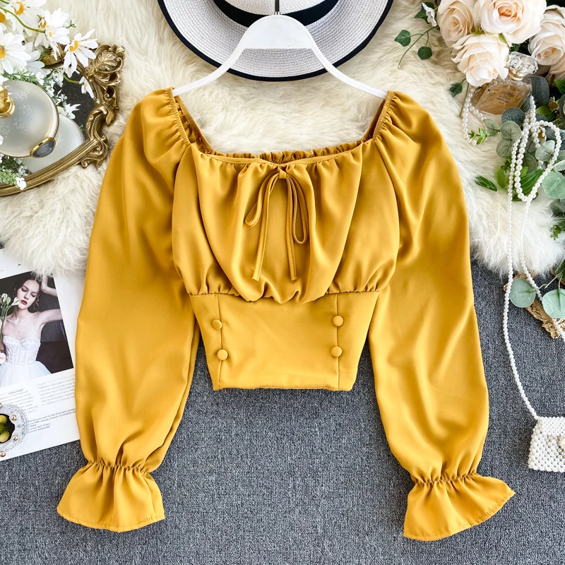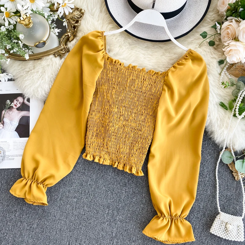 Женские короткие топы в стиле ретро с квадратным воротником и длинным рукавом, женская тонкая рубашка с эластичной резинкой на талии, однотонная блузка, Blusas Femininas Elegante K376