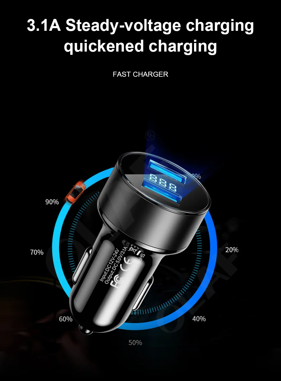 Универсальное автомобильное зарядное устройство с двумя USB-портами и светодиодным дисплеем 3,1 а для Xiaomi Samsung S8 S9 iPhone Xs Max 7 8 Plus, автомобильное зарядное устройство для планшетов
