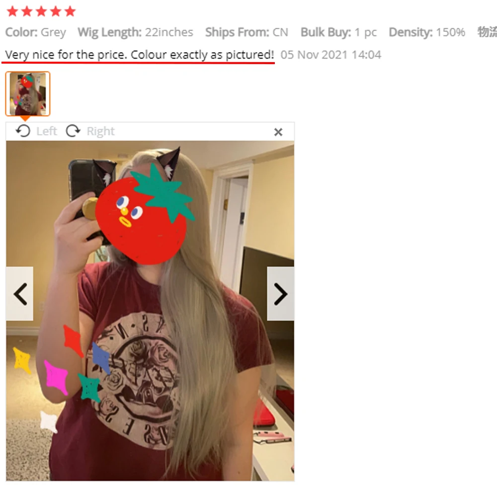 Отличный парик! Он выглядит точно так же, как на изображении стиля, и я думаю, что цвет точен в том, как он выглядит на моем экране, это красивый светло-серый. Кажется очень хорошо сконструированным и прочным, поэтому это определенно отличное соотношение цены и качества! Рекомендуется.