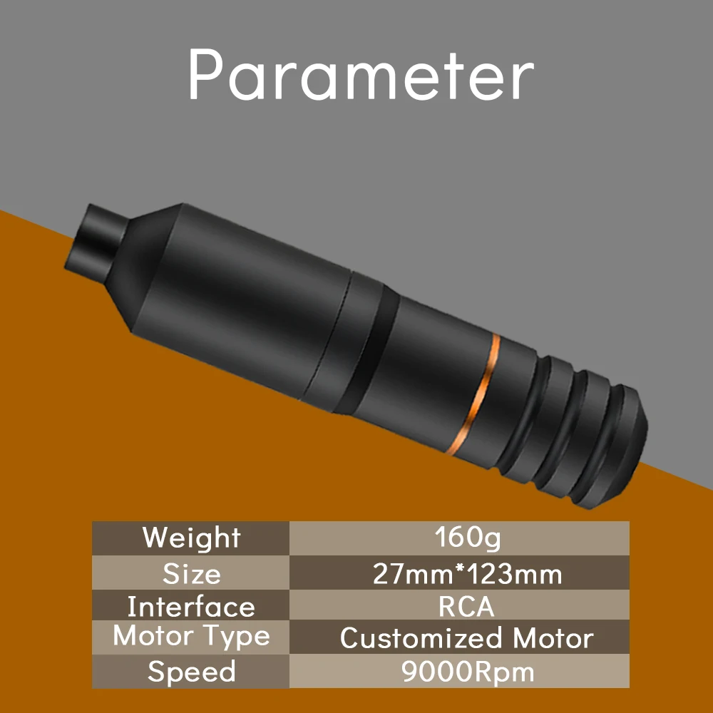 Спецификация Материал: алюминиевый сплавРабочее напряжение: 6 - 9 вСкорость вращения: около 8000 - 9000 раз в минутуСодержание упаковки: 1 х ручка для татуировкиВыступ иглы: 3,5 мм, RCA
