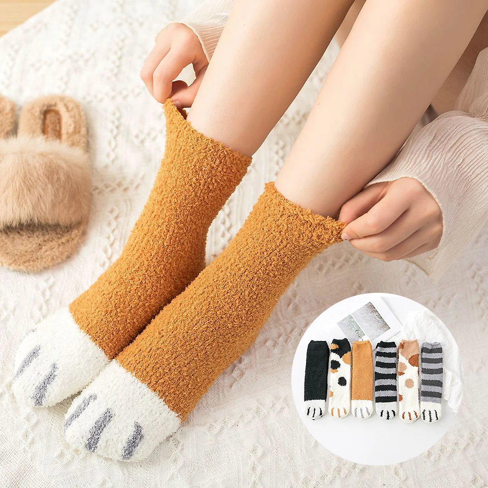 1 пара плюшевых коралловых флисовых носков, женские носки-трубы, осень и зима, милые плотные теплые носки с кошачьими когтями для сна 3