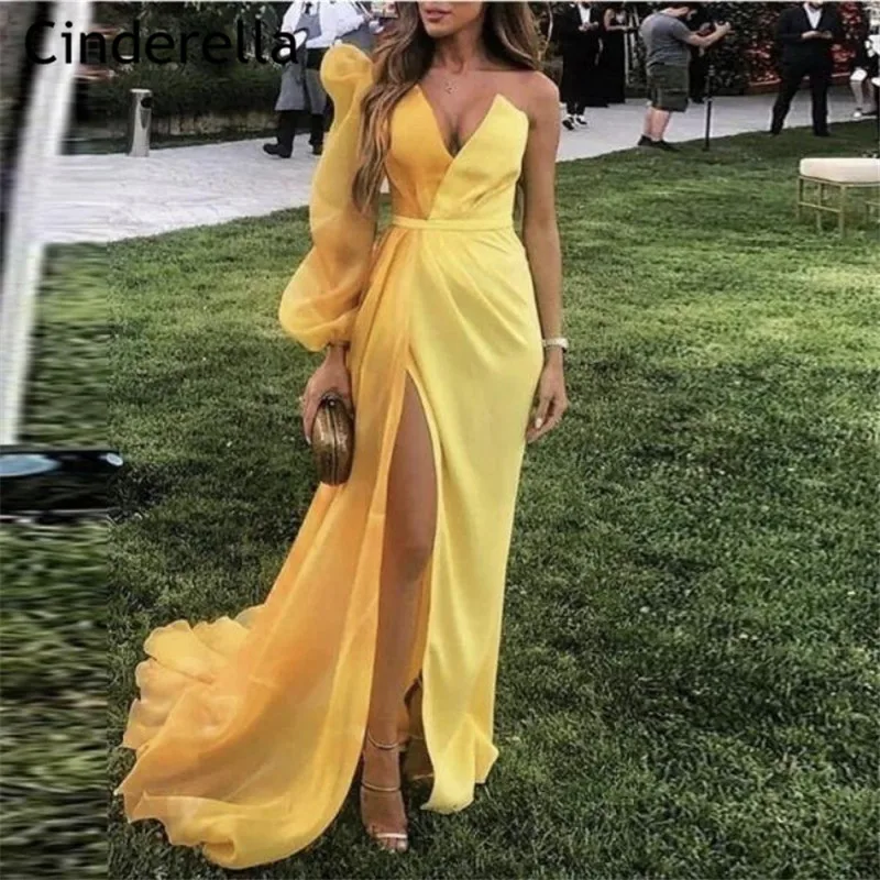 Вечернее платье с длинным шлейфом, одним рукавом, с длинными рукава...