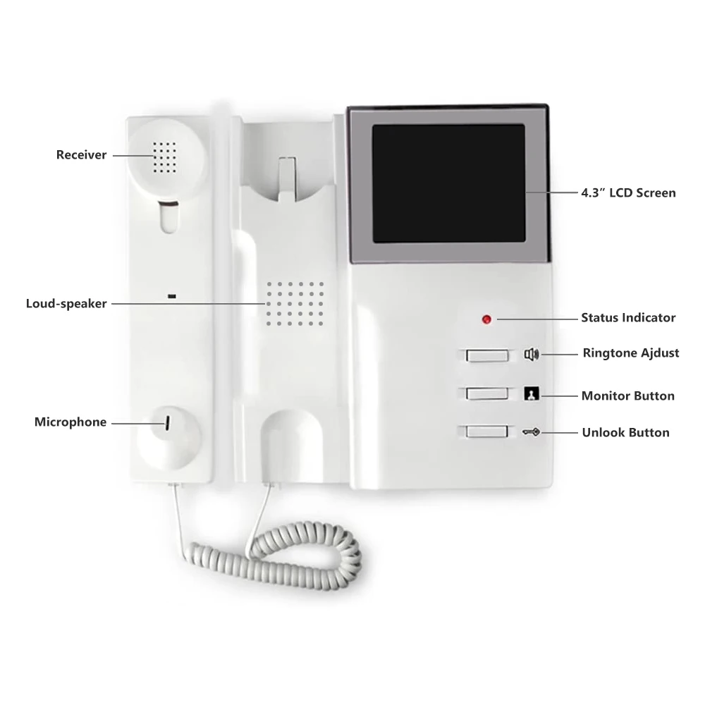 Красочный видеодомофон имеет выдающееся значение на рынке домофона и дверного звонка. Он поставляется полностью с полным набором инструментов для видеодомофонов, включая монитор безопасности, камеру, домофон и другие аксессуары. С 4,3 ''с высоким разрешением цветной TFT ЖК-дисплей и ИК-камера, изображение очень хорошо видно даже в ночное время.