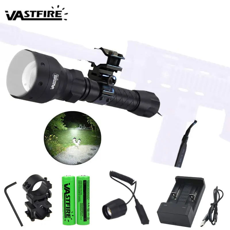 Тактический охотничий фонарик T50, масштабируемый, 500 ярдов, 55 мм, объектив, фонарь для оружия, ружья + крепление для прицела + переключатель + 18650 + зарядное устройство USB