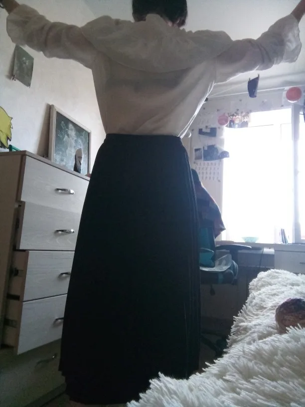 мегакрутая юбка! сидит на мне даже лучше, чем я ожидала. приятная тянущаяся тёплая ткань. милые складки. а еще она забавно поднимается, когда я кручусь. правда, я пока не стирала её. мой рост 160 сантиметров, если что!~