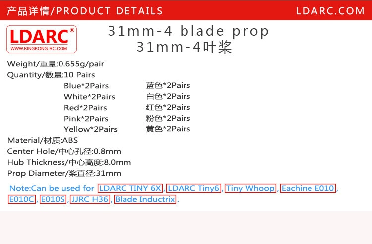 LDARC 31 мм 4-Лопастной пропеллер 0,8 мм смешанных цветов для RC FPV Racing Freestyle Tiny6X E010 E010S E010C H36 матовый Tinywhoops