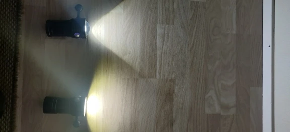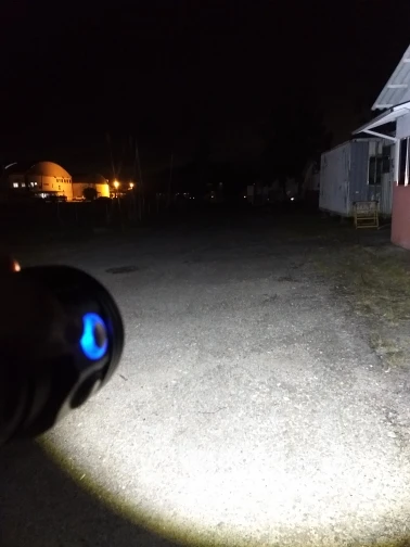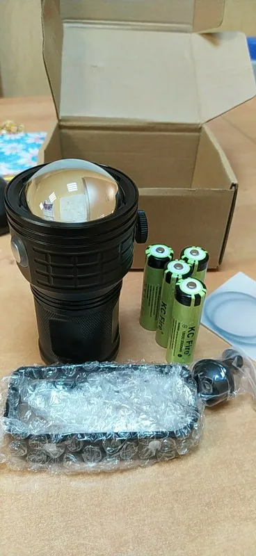 Фонарь понравился. Выглядит добротно. Не знаю есть ли тут 5000лм, но светит очень ярко тёплым светом. Дистанция метров 20, но широкий конус: порядка 60 градусов. 4 аккумулятора. Тяжёлый. Ехал в Украину около 3 недель.