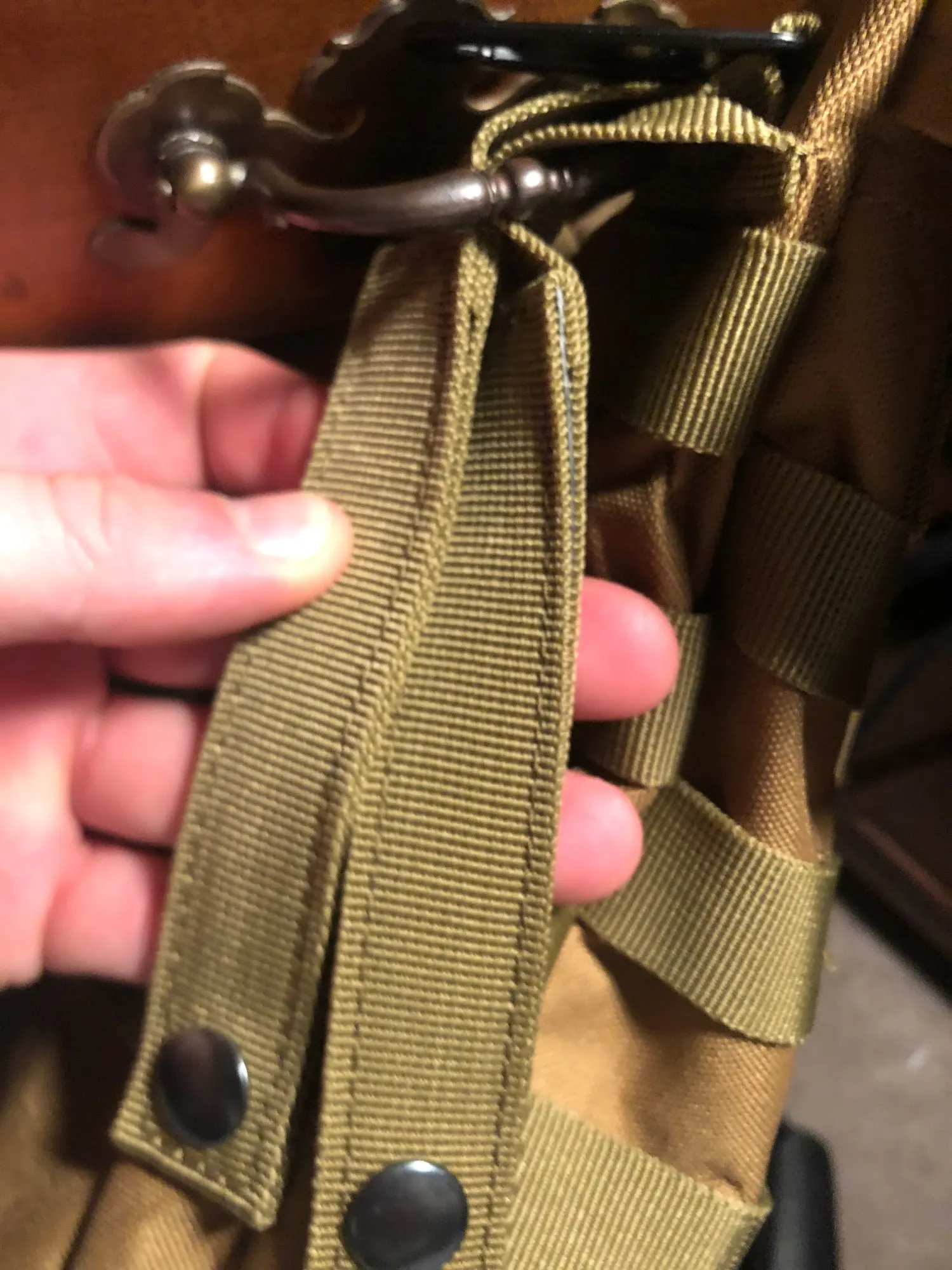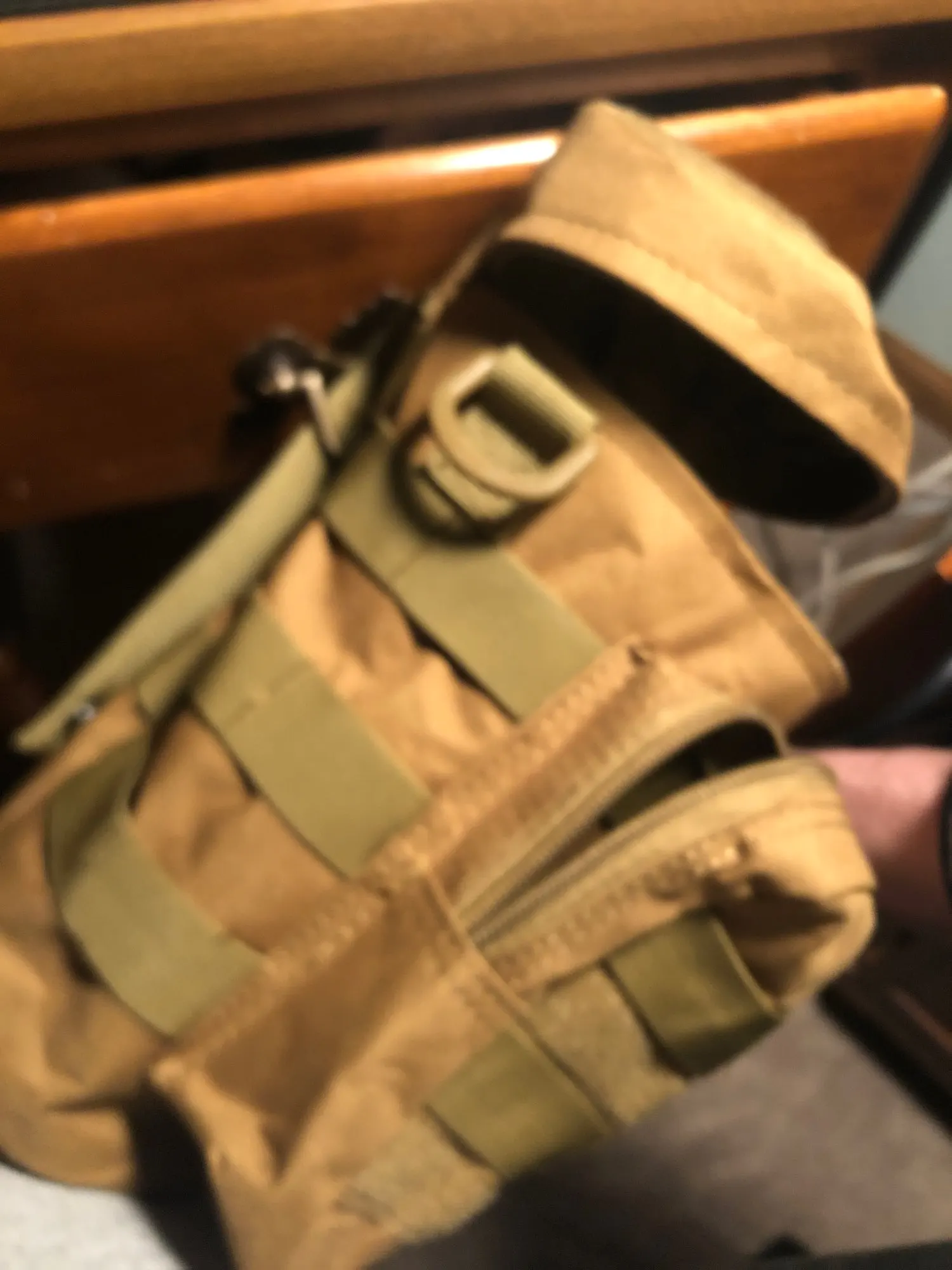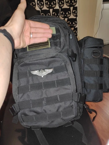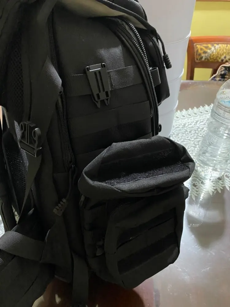 Задняя стенка двойная, на первой части основание со стропами молли, стяжкой на фастексе и велкро с другой стороны. Вторая часть с велкро является стенкой непосредственно сумки. Когда тянешь за ручку на сумке, половинки разъединяются и сумка остаётся в руках. Интересно для быстрого снятия и переноса, но не логично для не знающих об этом. Человек со стороны долго будет понимать, что нужно дёргать ручку, а не как-то отцеплять сумку. Нужна текстовая пометка на сумке о том, как надо делать.