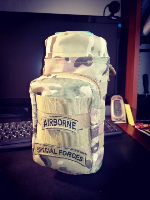 Чехол для бутылки для воды или сжатого воздуха. Основной карман принимает бутылку объемом 1,25 л от известного американского производителя соды. Передний карман без проблем принимает два советских AI-2 медицинских набора и пластиковую коробку для планшета, и есть еще место для ручек или шприцев. Застежка-липучка в верхней части основного кармана и две маленькие полоски на липучке на передней стороне вторичного кармана, удобны для фиксации различных пластырей. Чехол можно зафиксировать с помощью мягких петель, плечевой ремень с помощью двух петель для ремня, расположенного с каждой стороны, или подвесить Благодаря металлической застежке, расположенной сзади. Идеально подходит для косплея моего сталкера!