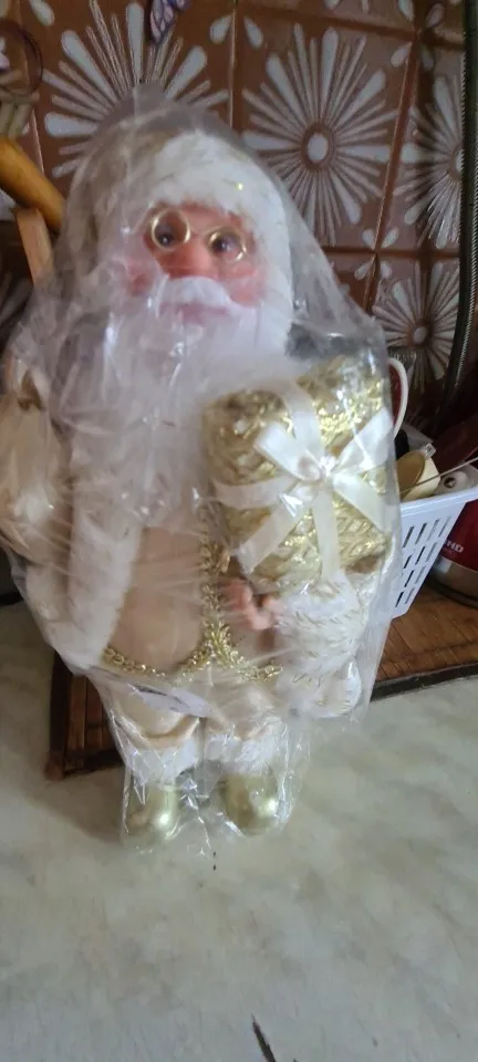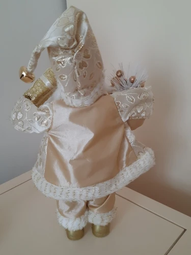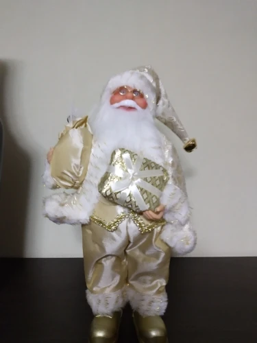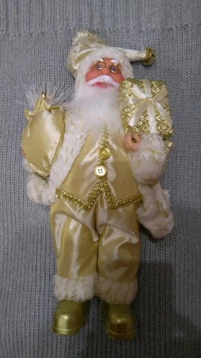 Заказала стоящих двух Санта Клаусов в золотой одежде, на подарки. Визуально симпатичные. Очень легкие (ни на что не влияет, просто странно). Рукава у них пустые, и это заметно, придется туда ваты набить, наверное. У одного из Сант кривые очки. И рука с подарком вытянута по шву, как у солдата в строю, а не согнута. У другого некрасивый ботинок, со вмятиной. В общем, куча мелких неаккуратностей. Но я в целом довольна куклами за такие деньги.