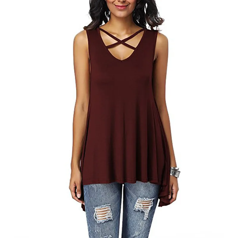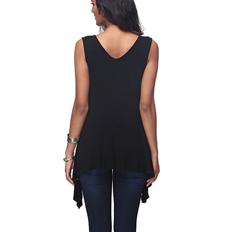 Летние черные топы для женщин, одежда, передняя грудь, крест, v-образный вырез, без рукавов, свободный, асимметричный жилет, футболка, рубашки, женская одежда