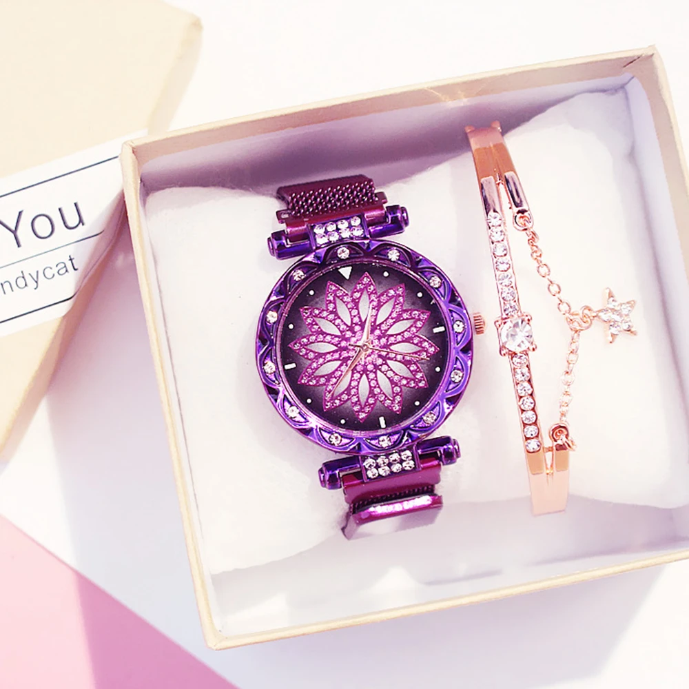 Комплект женских часов Relogio Reloj, кварцевые часы с сетчатым браслетом, с магнитной пряжкой, с цветами, стразы, Прямая поставка