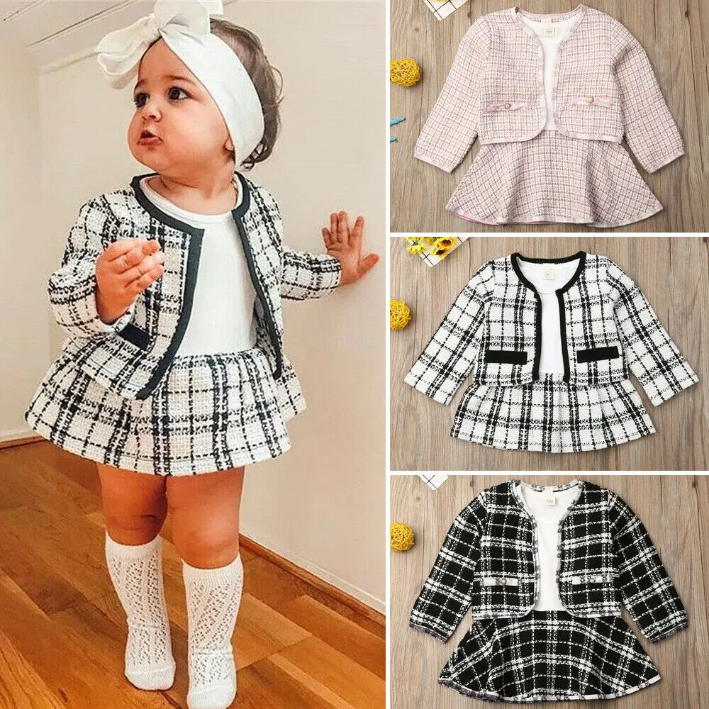 Демисезонный комплект одежды для маленьких девочек из 2 предметов, клетчатое пальто с длинным рукавом, топы, платье на день рождения, модный праздничный комплект для девочек