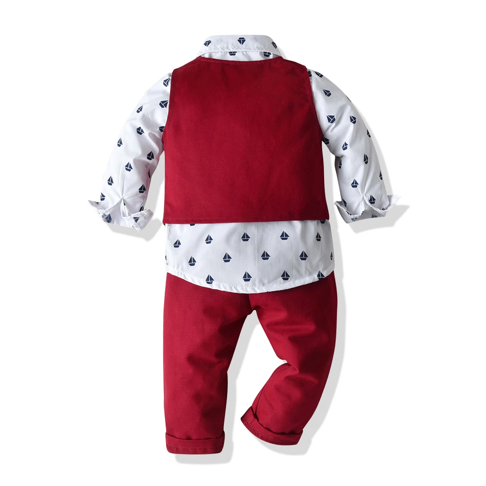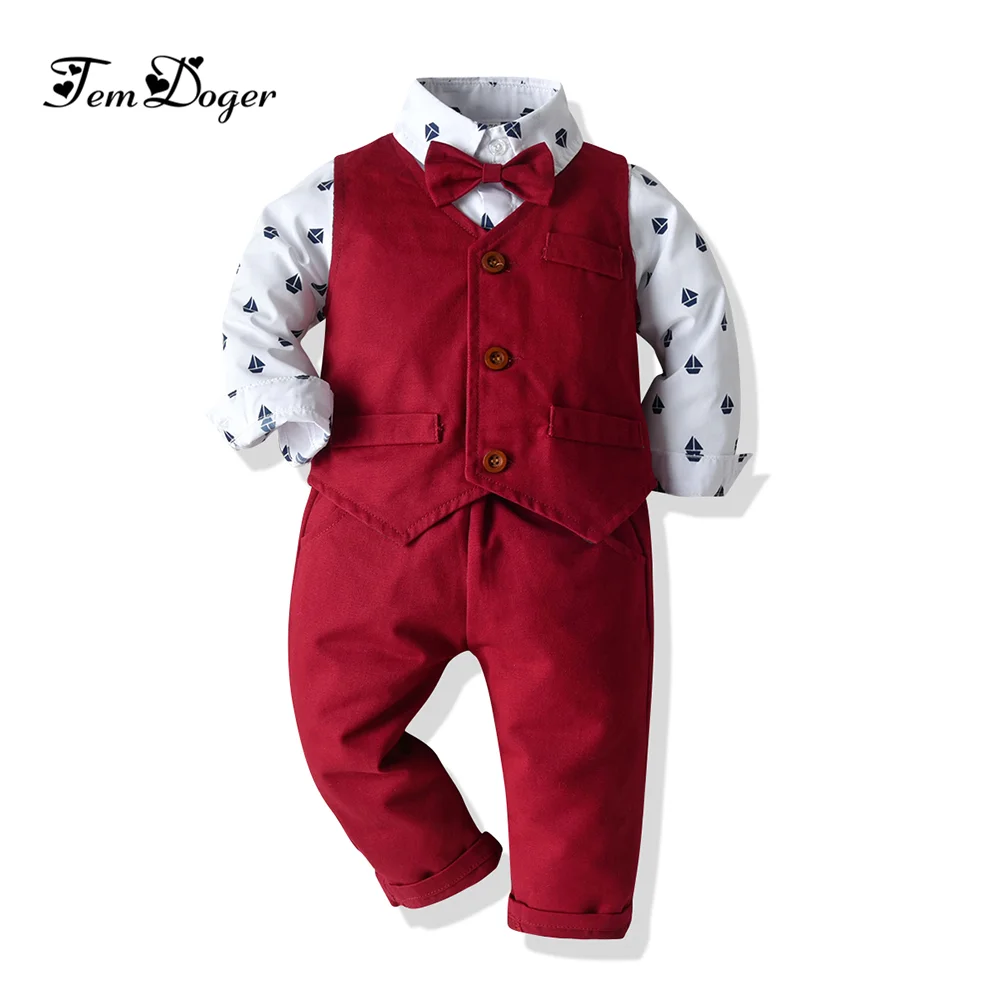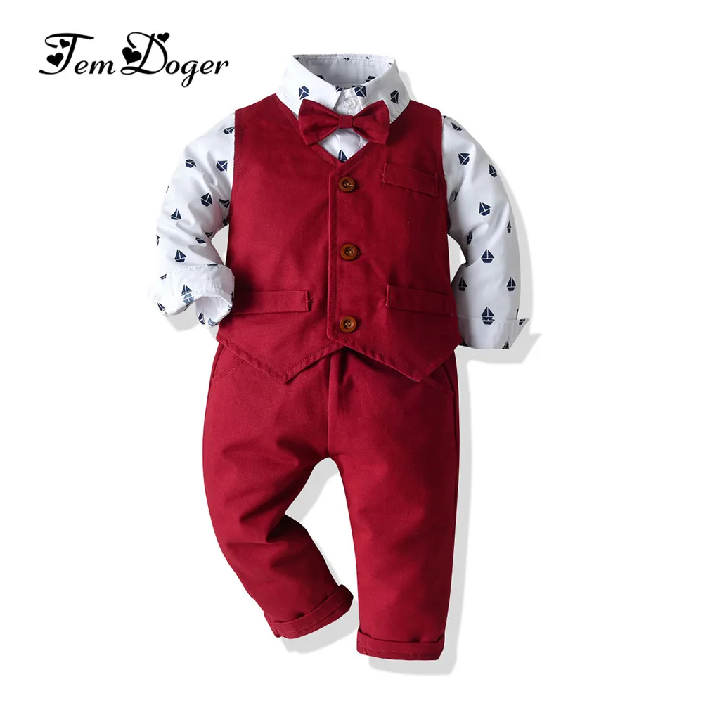 Tem Doger для маленьких мальчиков из 3 предметов, костюм-смокинг, хлопок, длинный рукав, Футболка с принтом и брюки; Жилет; Спортивная куртка официальная одежда, костюм в стиле "Джентельмен"