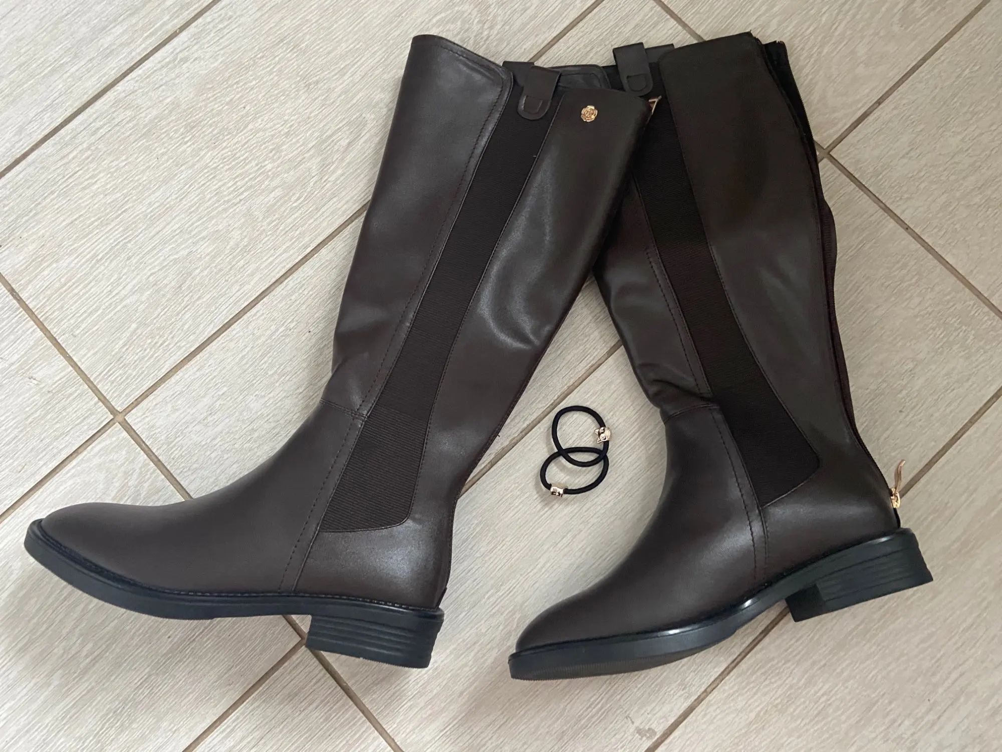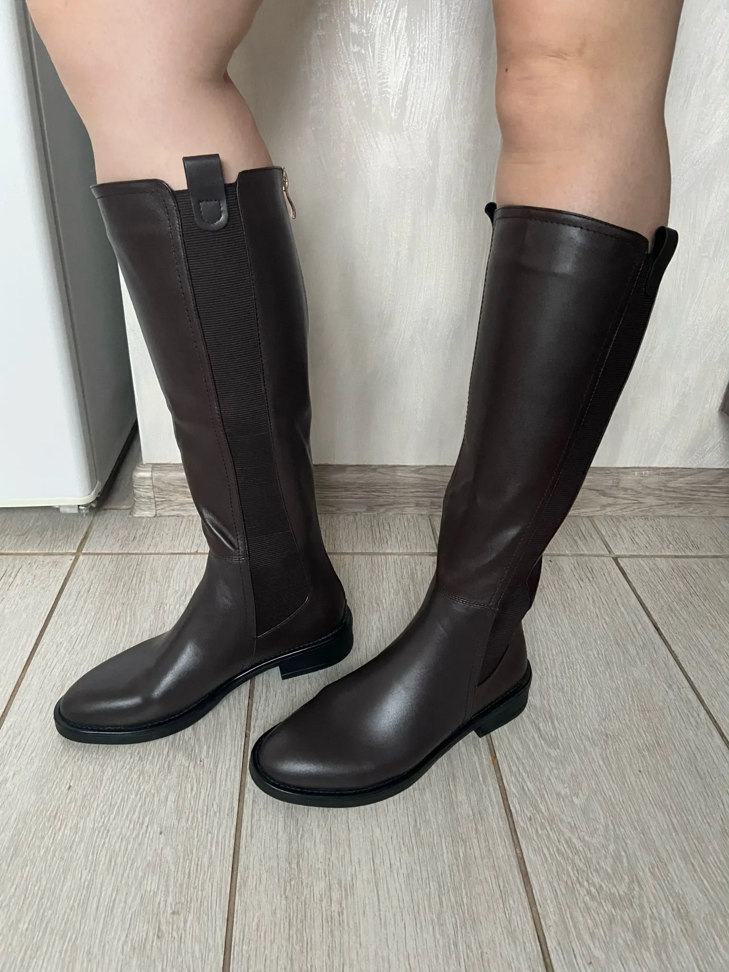 Шикарные сапоги, пришли идеально запакованы. Цвет насыщенный темный коричневый, размерная сетка верная на рус 37 (стопа 24см) почти всегда беру китайский 38. Подойдут на неузкую голень (у меня это проблема) моя голень 38см в широкой части, застегнутся и на более пухлых ножках (спасибо резиновым вставкам по бокам). Фурнитура золотая, но дёшево не смотрится, Внутри плюш. Если погода в Москве в этом году зимой будет как прошлая зима)) прохожу всю зиму, мне мех поседение несколько лет не нужен совсем, избавляюсь почти от всех зимних сапог.. глобальное потепление что ли.. Сапоги рекомендую! Брала с купонами, вышли оч выгодно.