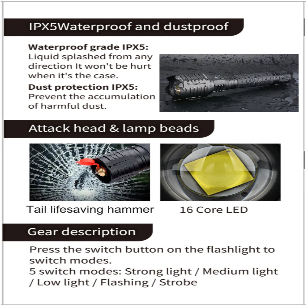 16-жильный светодиодный, водонепроницаемость IPX5, функция ввода и вывода, индикатор заряда батареи, телескопический зум, хвостовой молоток, можно использовать с аккумулятором 266650/18650