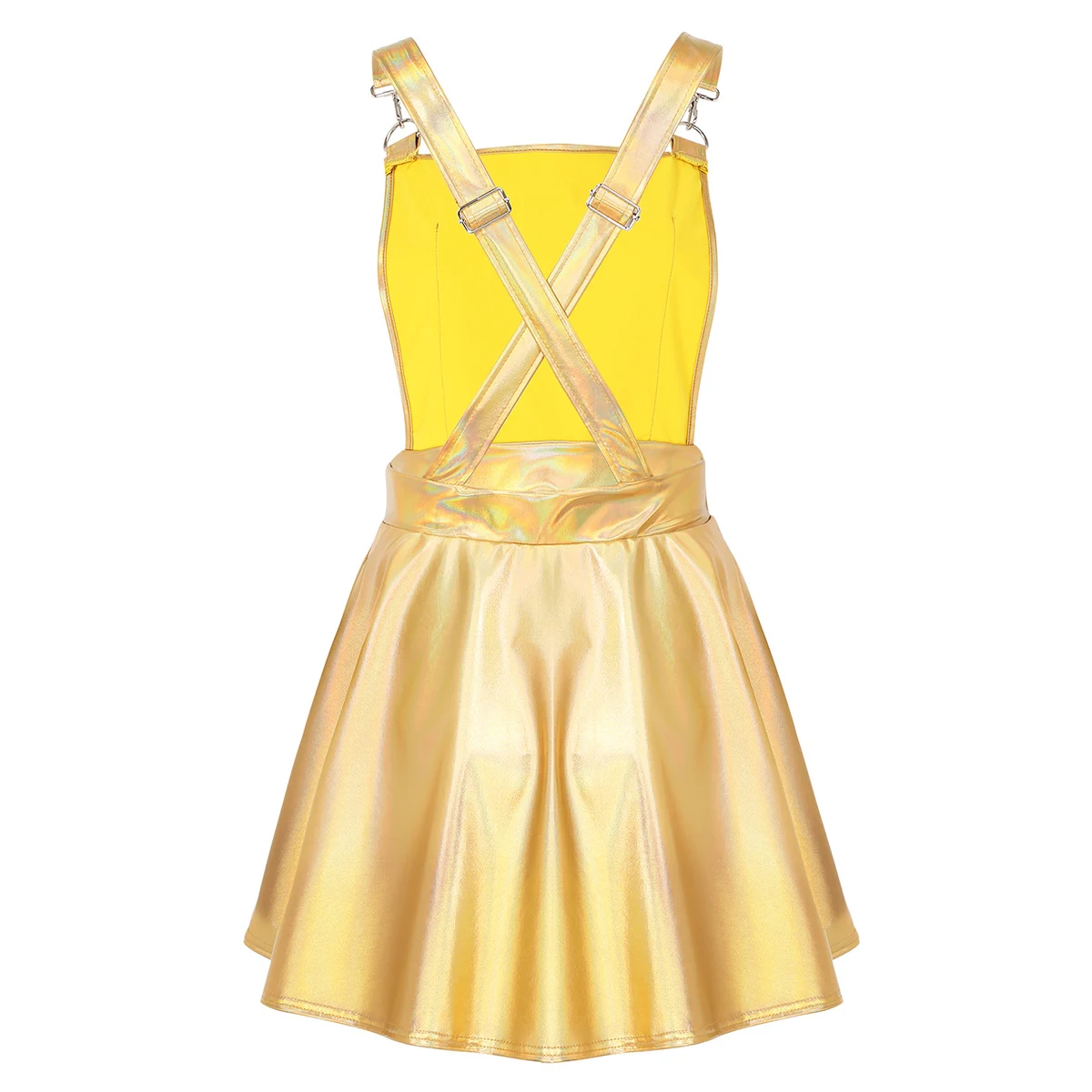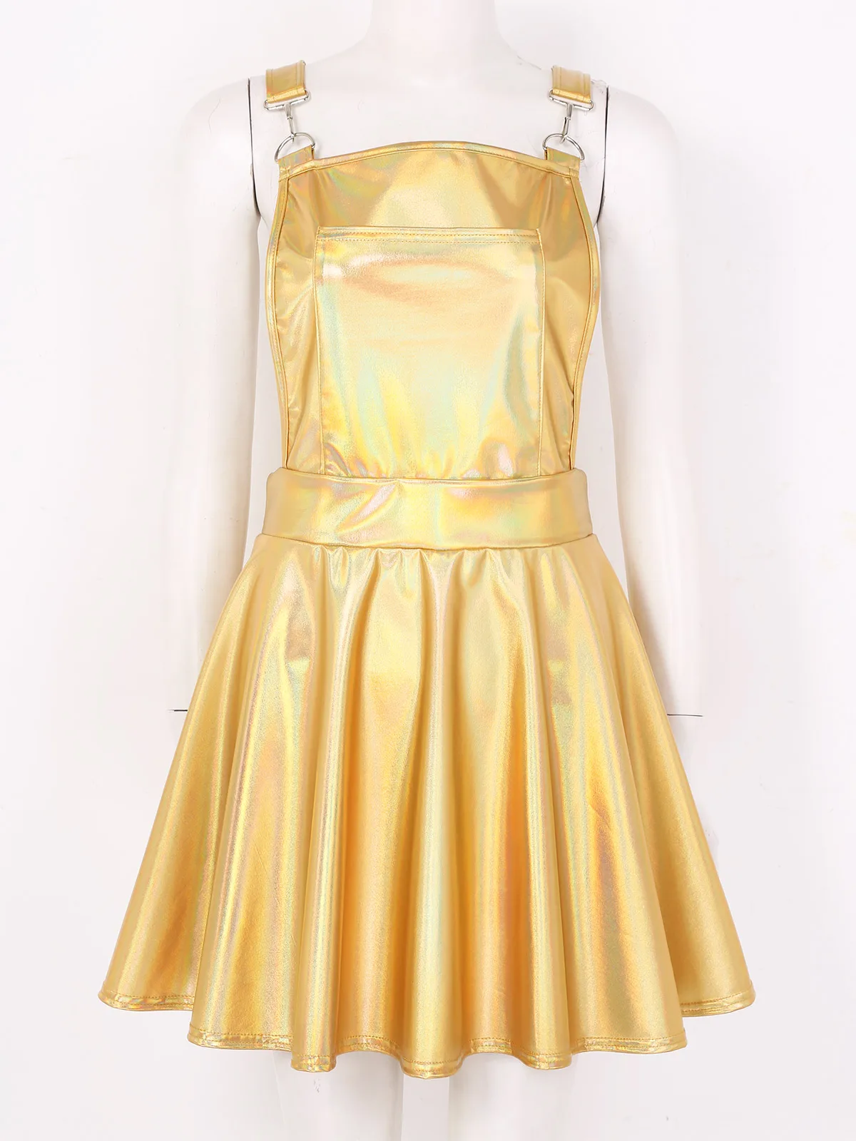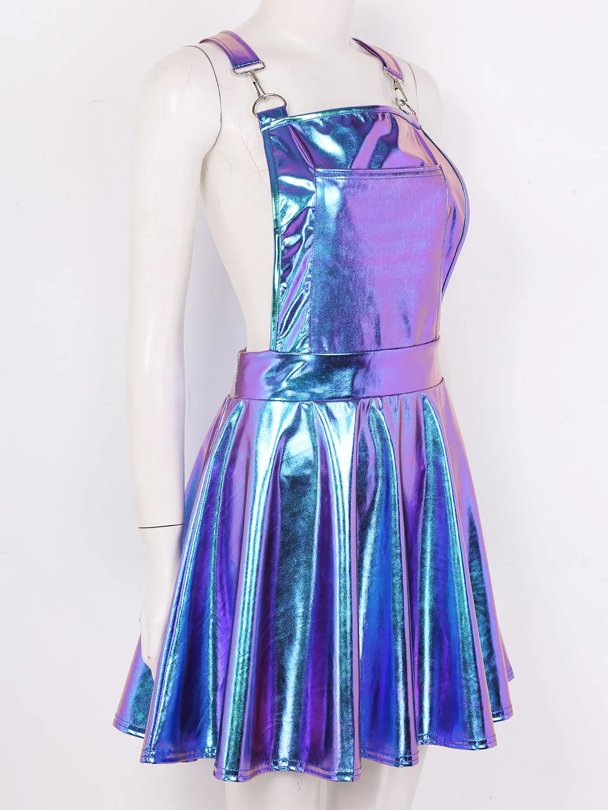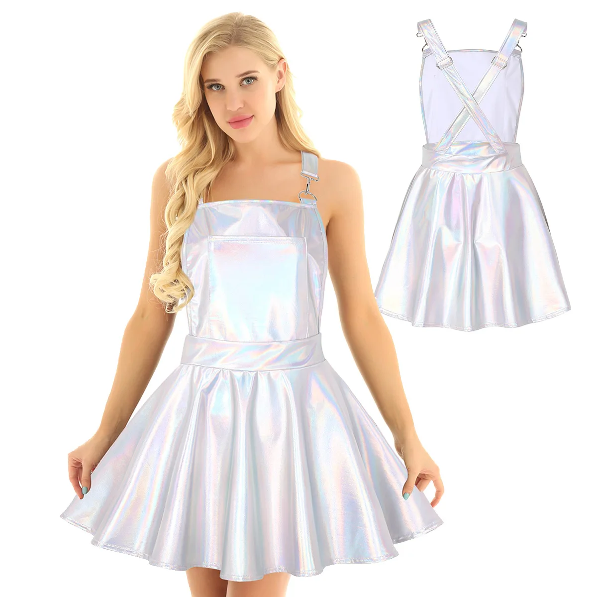 Женский Блестящий Комбинезон с металлическим нагрудником, платье с подтяжками, юбка мини подвязки, застежка на пуговицах.
