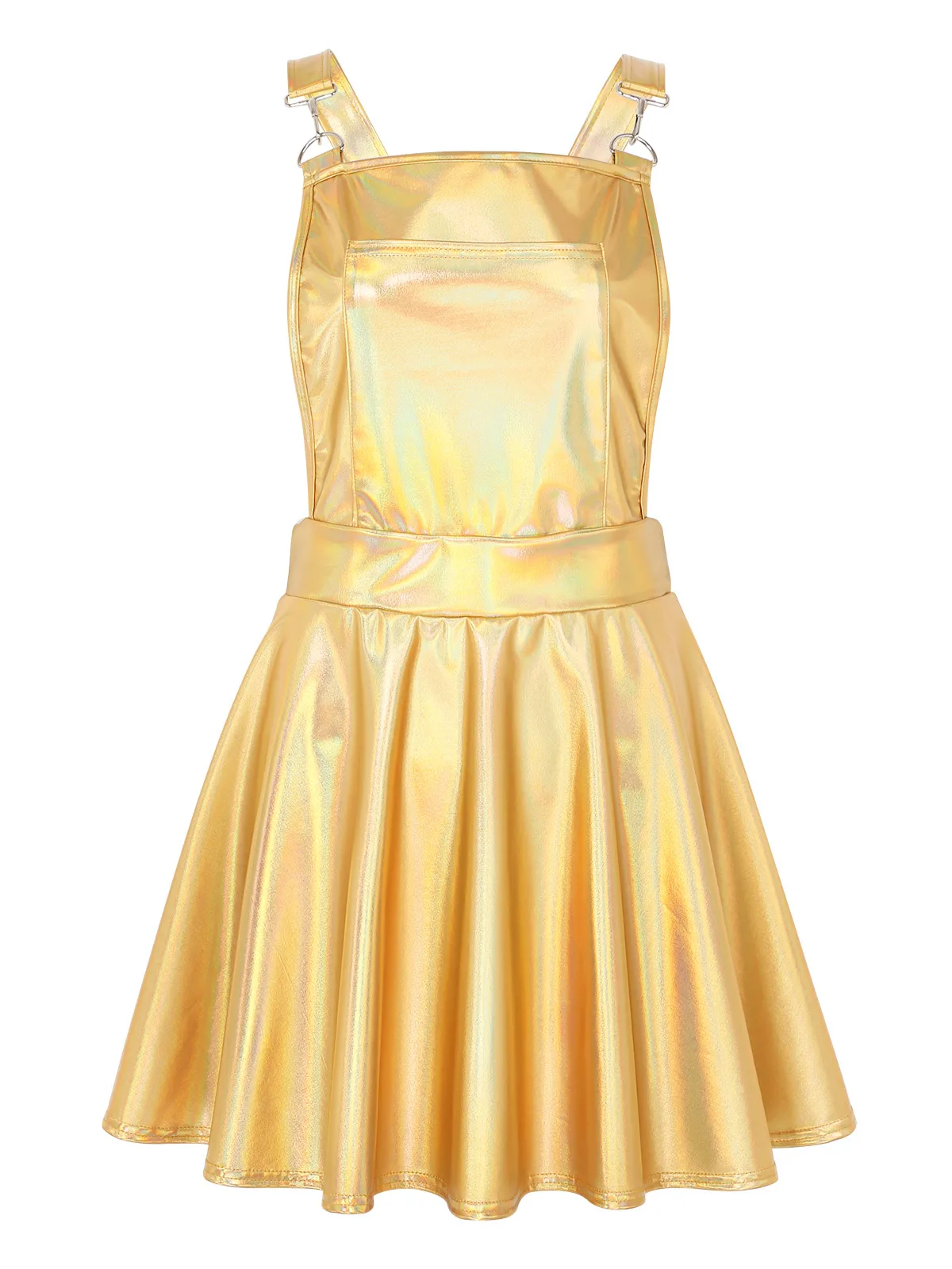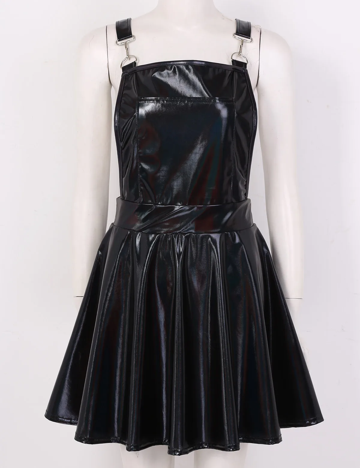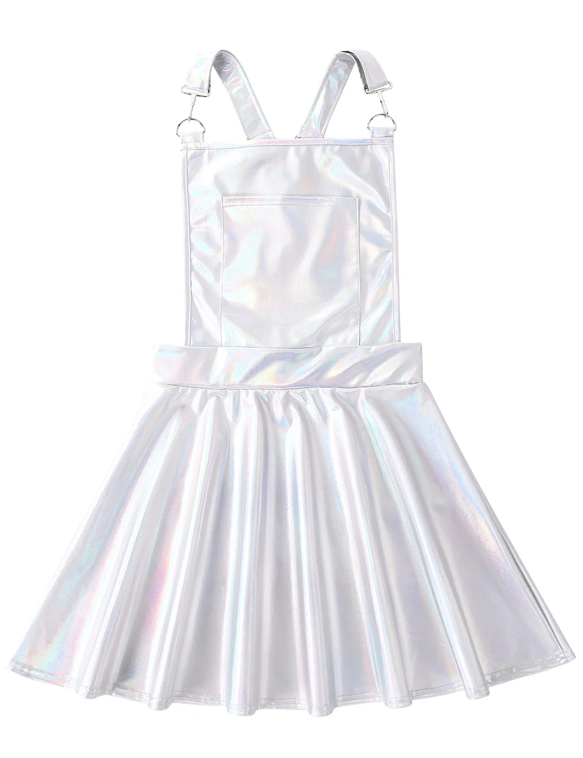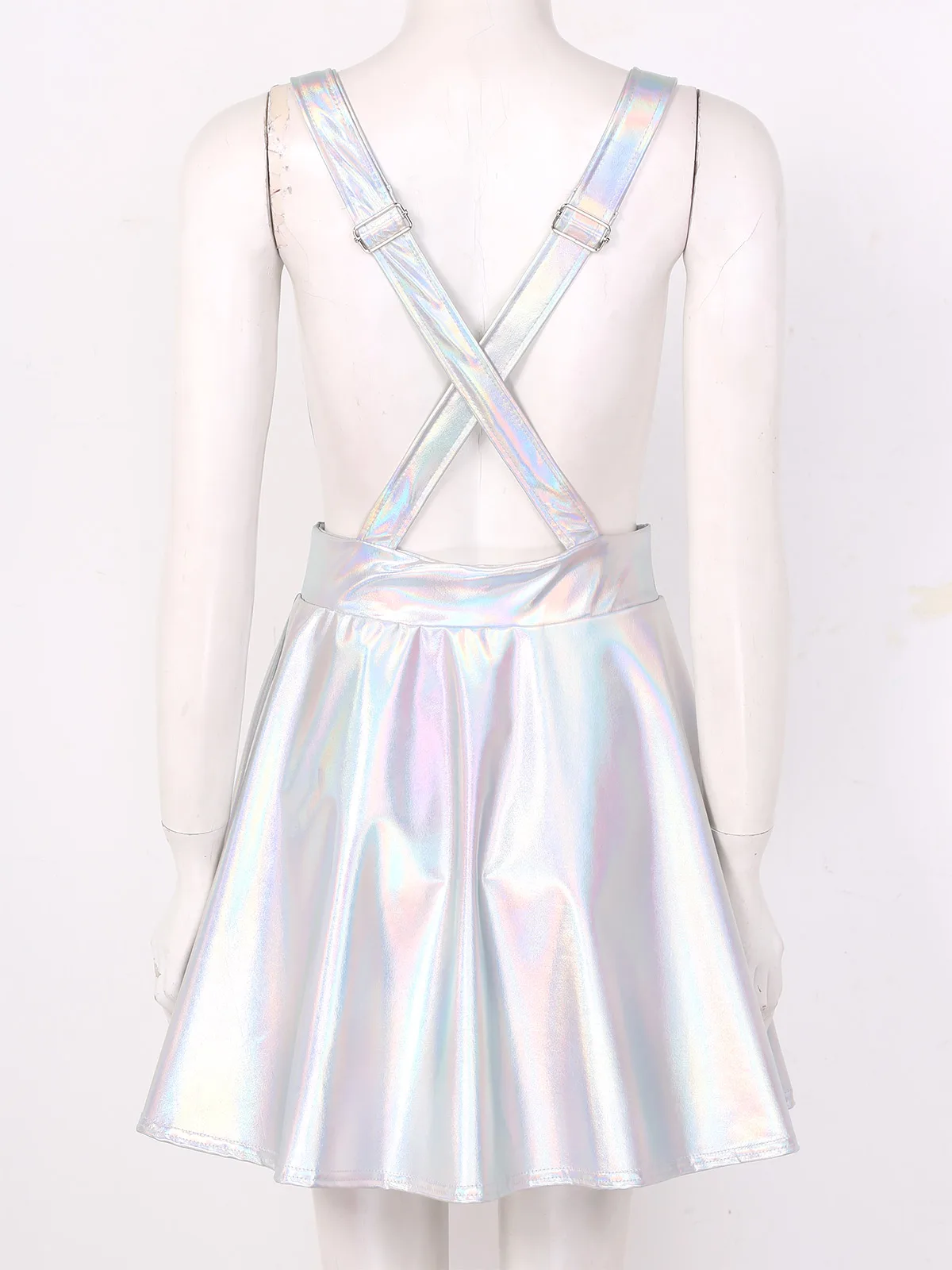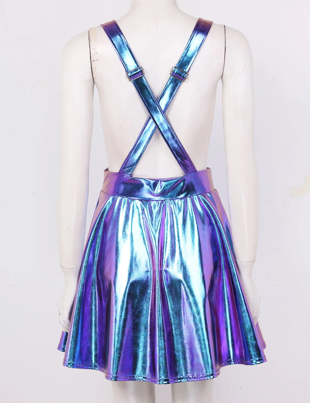 Женский Блестящий Комбинезон с металлическим нагрудником, платье с подтяжками, юбка мини подвязки, застежка на пуговицах.