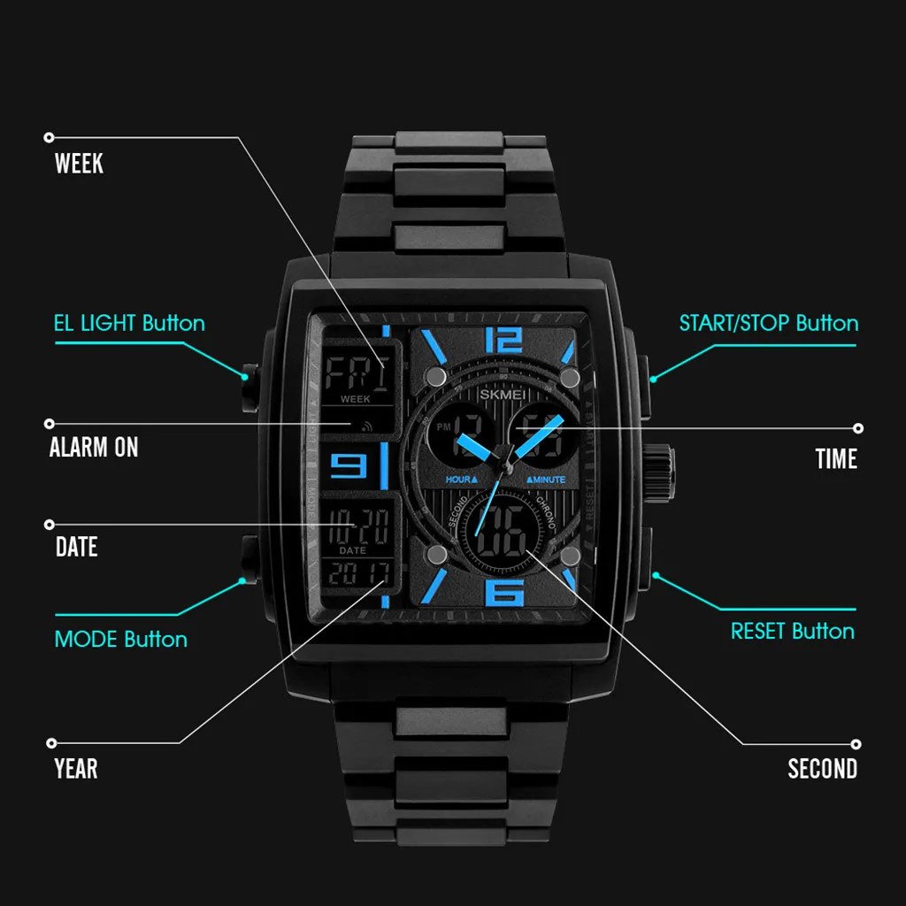 Бренд: SKMEI Авторизованный владельцем бренда, гарантия качества Ремешок для часов из мягкого полиуретана Чехол для часов из высококачественного поликарбоната Стекло для часов из смолы высокой четкости Пряжка для часов из нержавеющей стали Механизм: кварцевый аккумулятор Стильные прямоугольные часы с циферблатом Аналоговый и цифровой дисплей Многофункциональность: время/дата/Будильник/неделя/секундомер Светодиодный светильник, видимый в темноте Набор из 3 часовых поясов, красивый дизайн Поддержка 12/24H настройки Водонепроницаемость 50 м. Не нужно снимать во время плавания (избегайте горячей/теплой воды) Хороший подарок для себя и друзей, добро пожаловать на покупкуСпецификация: