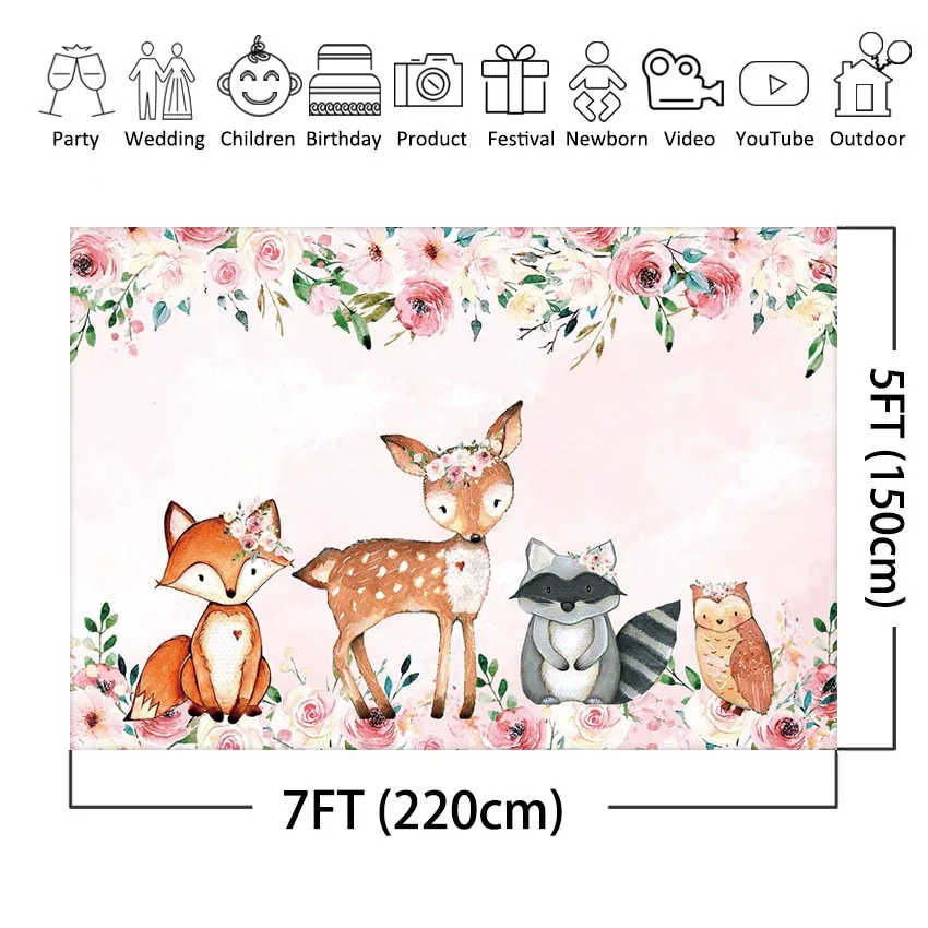 Фон для фотосъемки детей в стиле бохо с изображением розовых девочек и лесных животных