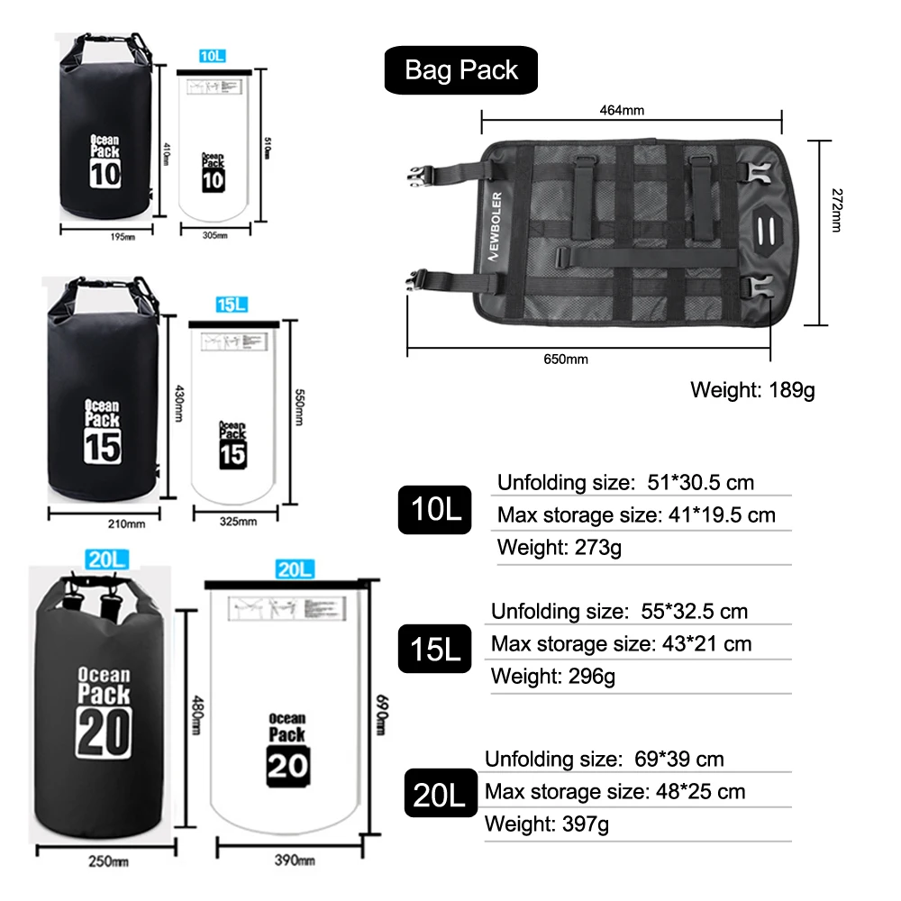 Цвет: черный/Камуфляж Объем: 3 - 20 л Размер крышки: 37*27 см/14,56*10,63 дюйма Размер сухого мешка: 3 л: 25*12,5 см 7 л: 50*15 см 10 л: 55*29,5 см 15 л черный: 55*37,5 см 15 л цвет камуфляжа: 57*36 см 20 л черный: 60*37,5 см 20л цвет камуфляж; 63 * 36см Посылка входит: 1 x сумка на руль велосипеда