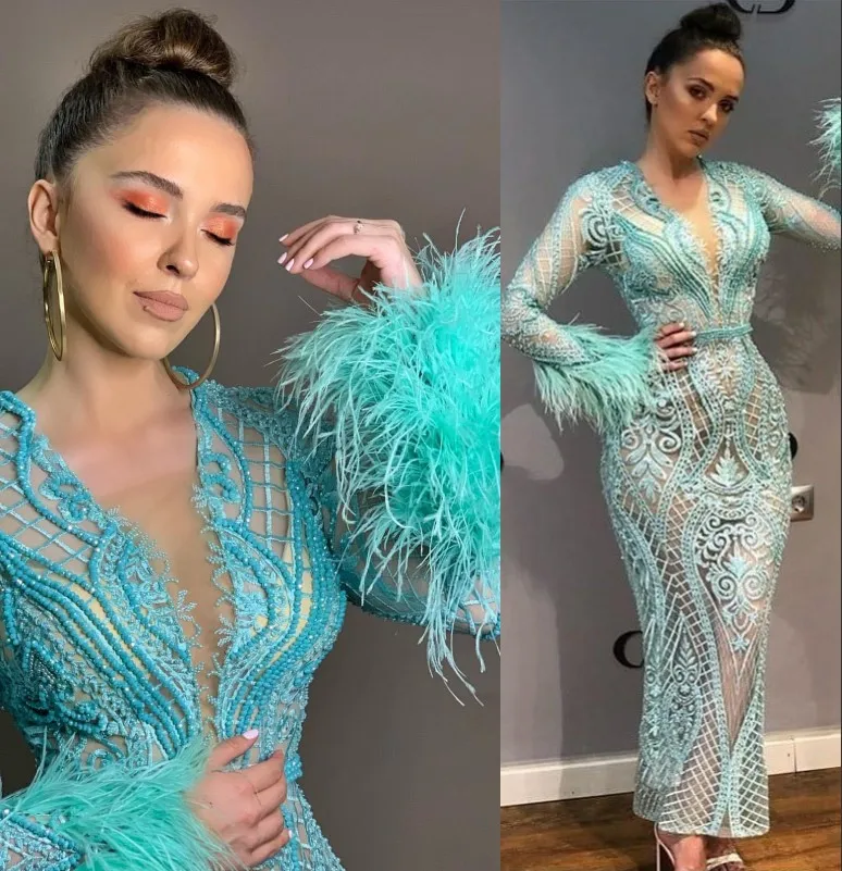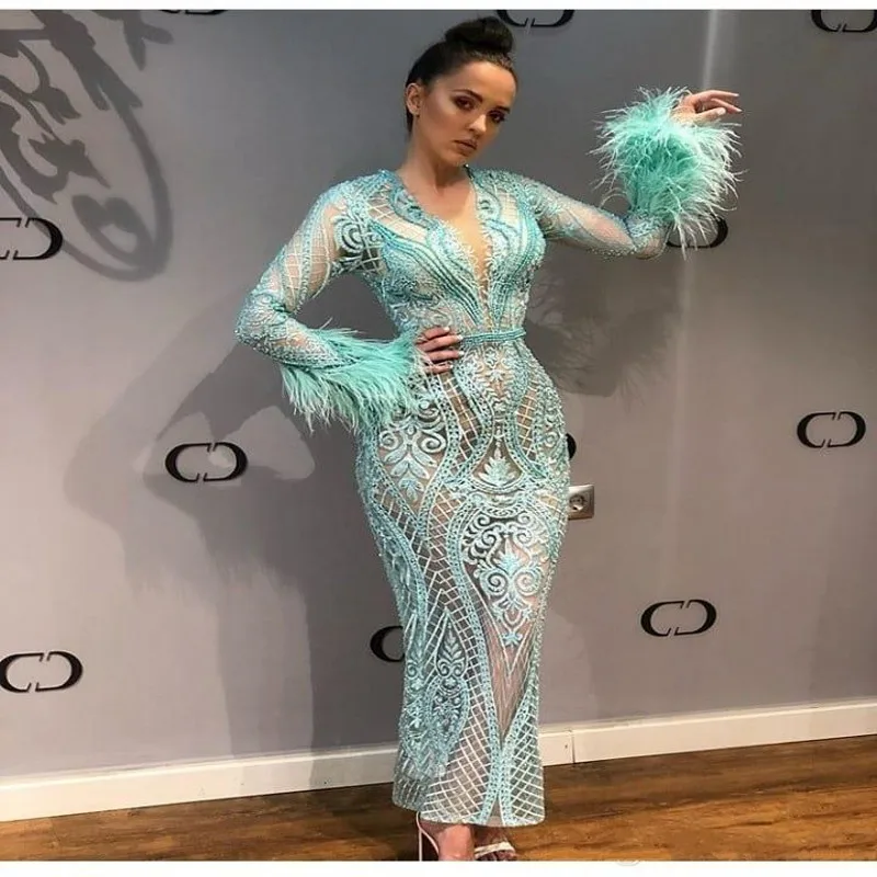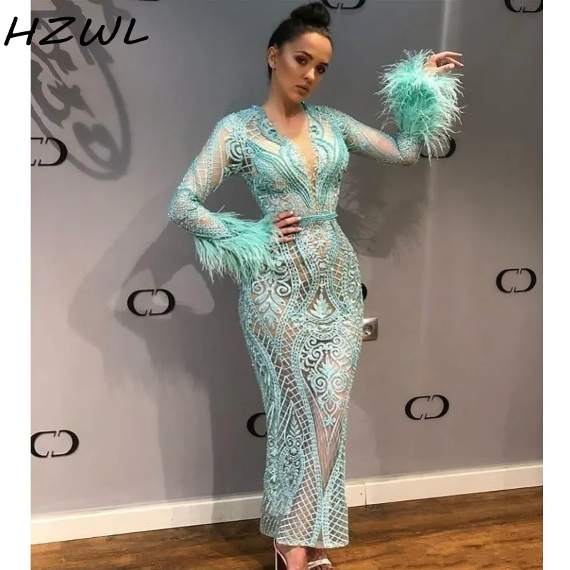 Женское вечернее платье до щиколотки, кружевное платье-Русалка с глубоким V-образным вырезом и платья с перьями для выпускного вечера, расшитое бисером