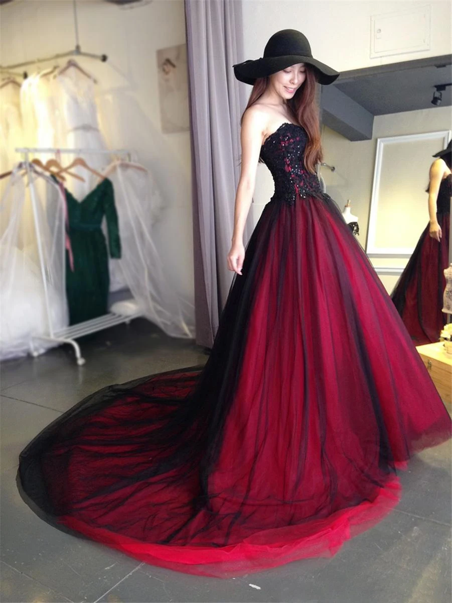 Готическое черное бордовое свадебное платье с сердечком, бусинами, шнуровкой сзади, длинным шлейфом, свадебные платья на заказ