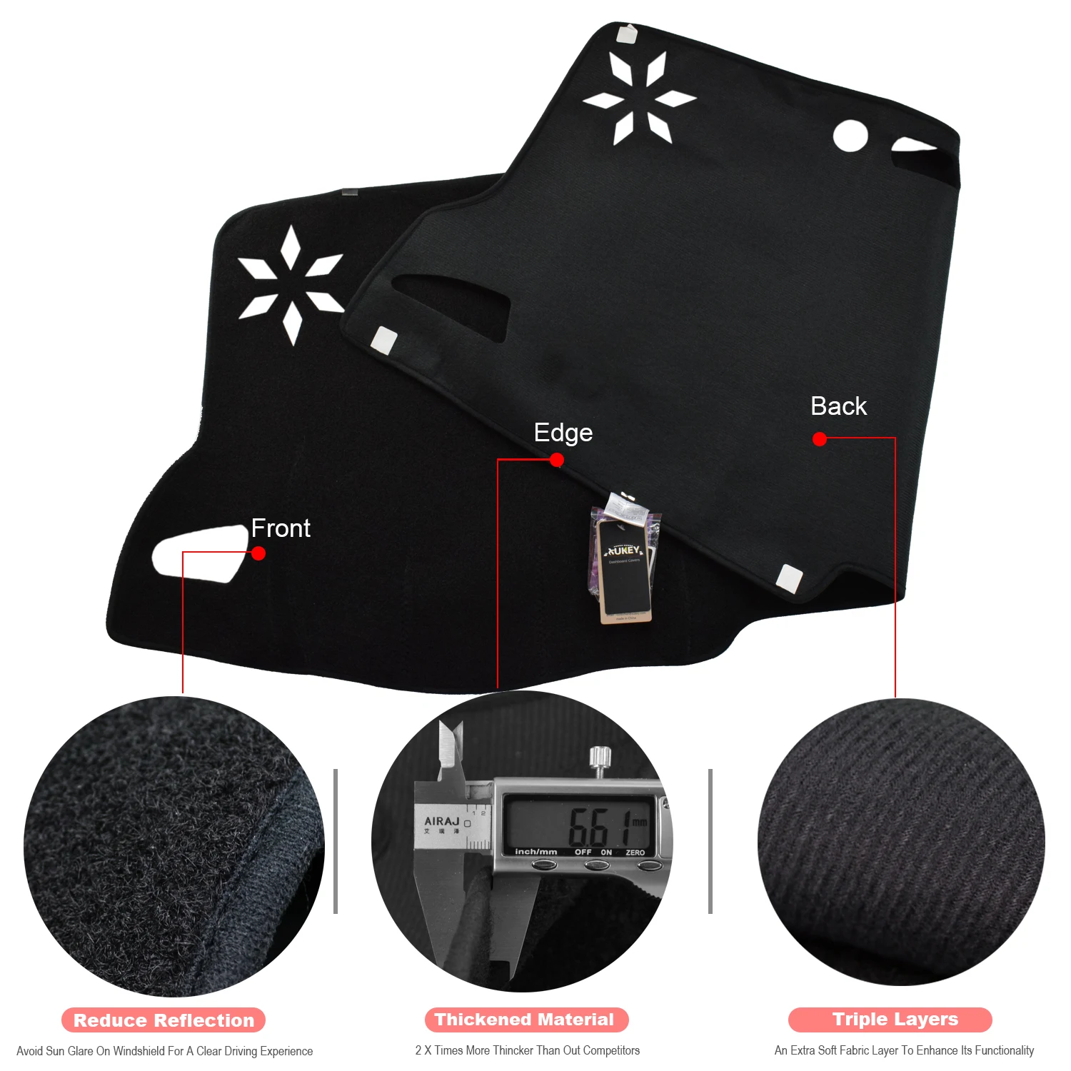 Простая установкаКонтуры для приборной панелиНе садится, не выцветает или не искажаетЗащищает приборную панель от ультрафиолетовых лучейУстраняет растрескиваниеУменьшает бликиУФ стабилизированная Высококачественная полиэфирная Автоматическая тканьДышит, чтобы рассеивать теплоБольшие вентиляционные вырезы, чтобы не ограничивать воздушный поток тумана