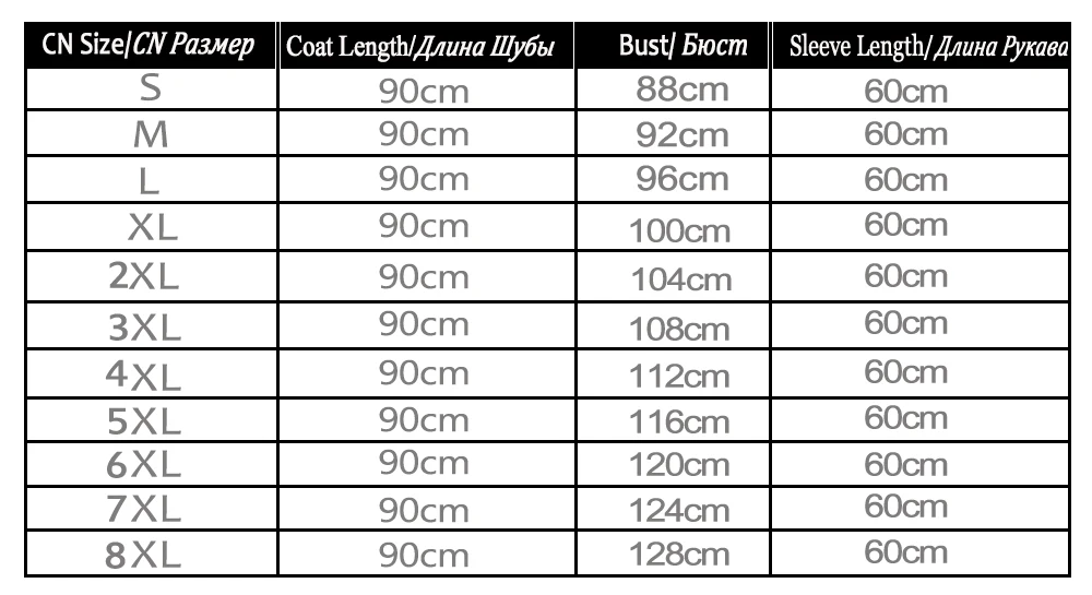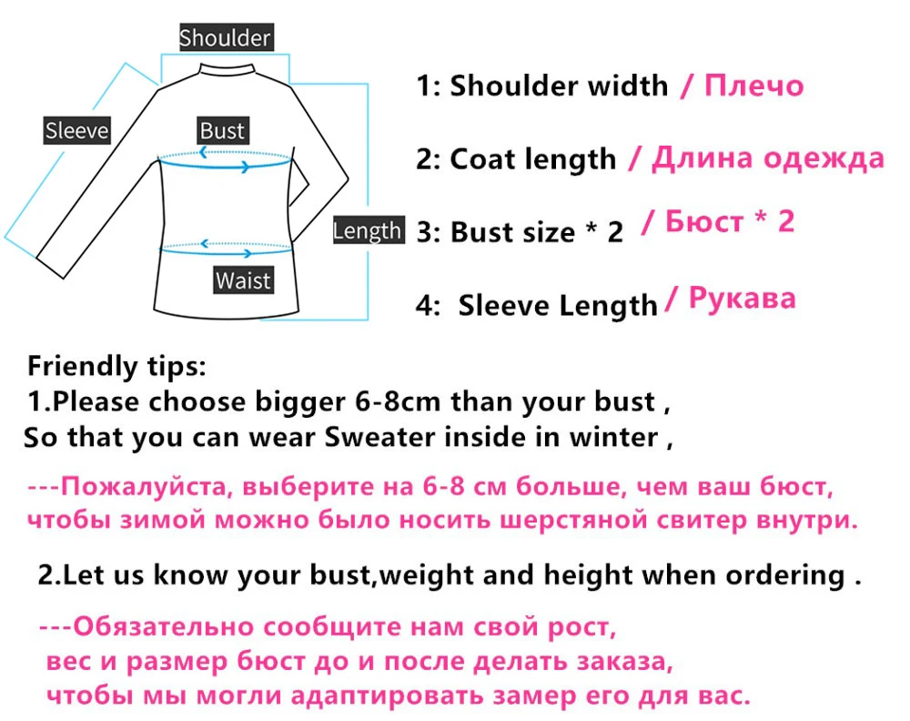 Обратите внимание, что:1.Это зимнее пальто, поэтому, как правило, мы советуем покупателю выбрать размер немного больше на 4-6 см, чем размер бюста, так что вы можете носить одежду внутри2.Если вы не уверены, какой размер выбрать, пожалуйста, свяжитесь с нами, мы поможем вам выбрать.3.Из-за проблемы съемки светильник и за разных цветовых настроек мониторов фактический цвет товара может незначительно отличаться некоторые пальто будет иметь отличие в цвете, если вы имеете что-то против, вы можете связаться с сотрудниками Отдела по обслуживанию клиентов, чтобы понять эту проблему.