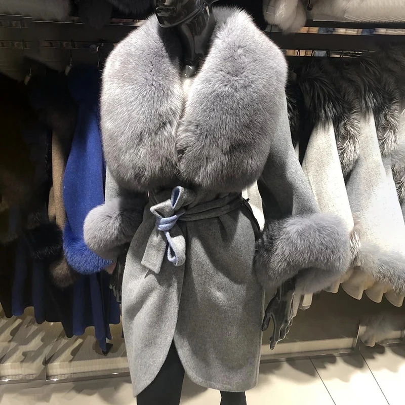 Пальто из смесовой шерсти с натуральным лисьим мехом, Длинная зимняя куртка, Корейская одежда, 2020