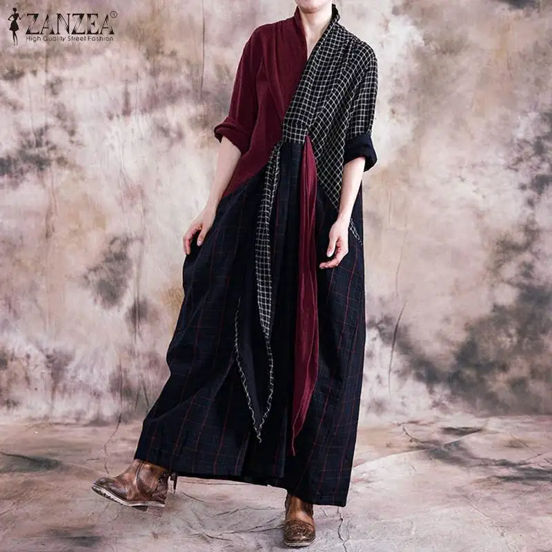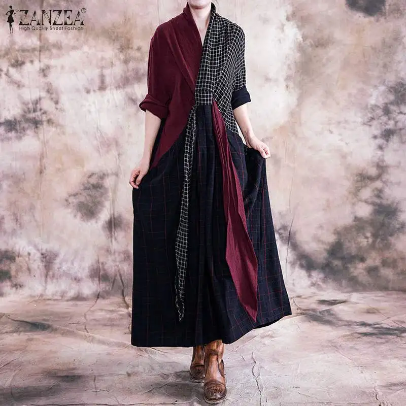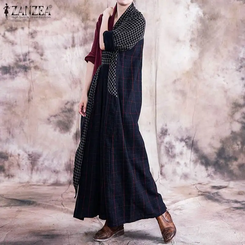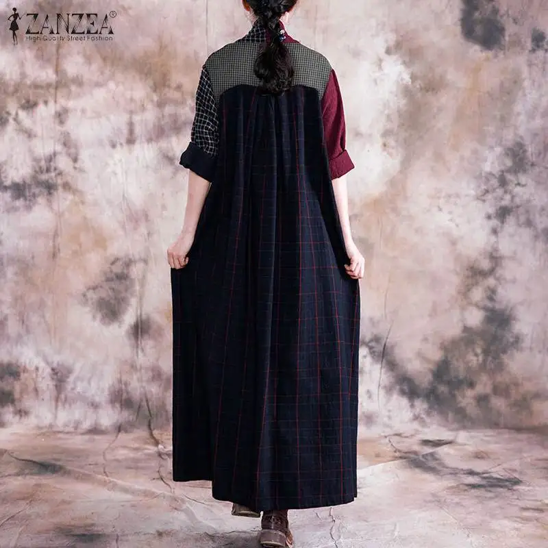 Платье ZANZEA женское винтажное в клетку, длинный сарафан в стиле пэчворк, свободный вечервечерние кафтан в ретро стиле, туника, осень