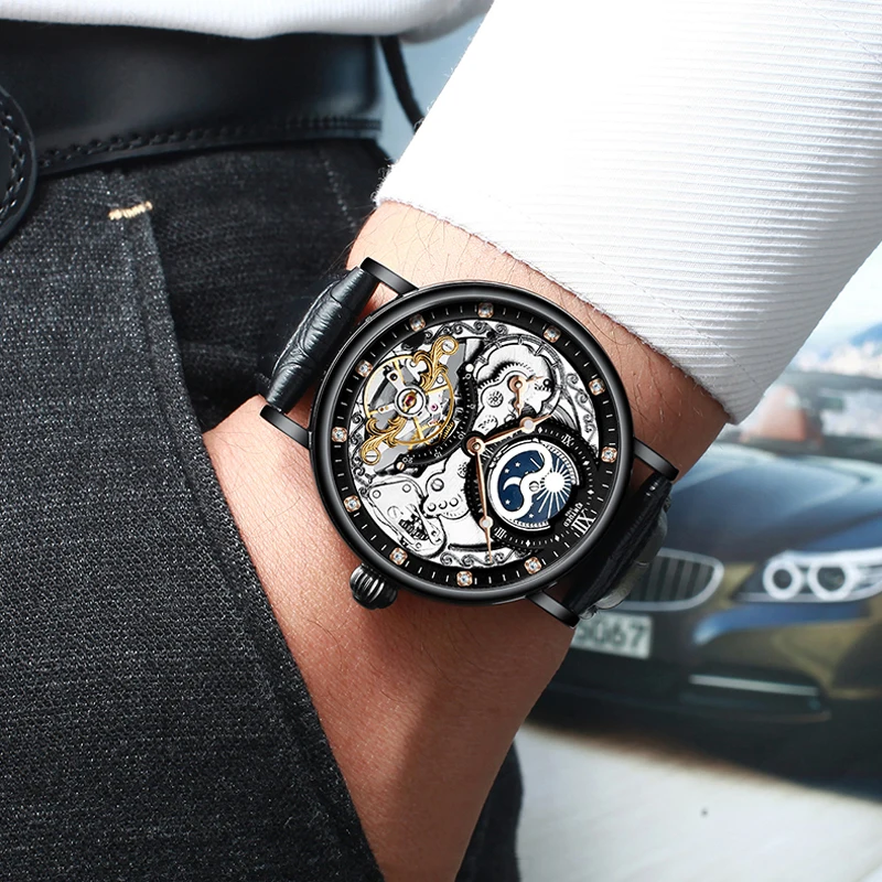 Часы KINYUED Мужские механические, дизайнерские водонепроницаемые автоматические брендовые люксовые, с черным ремешком, с турбийоном