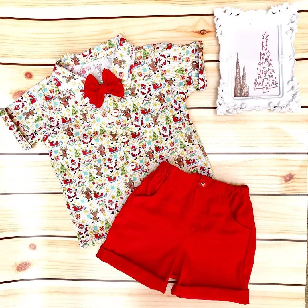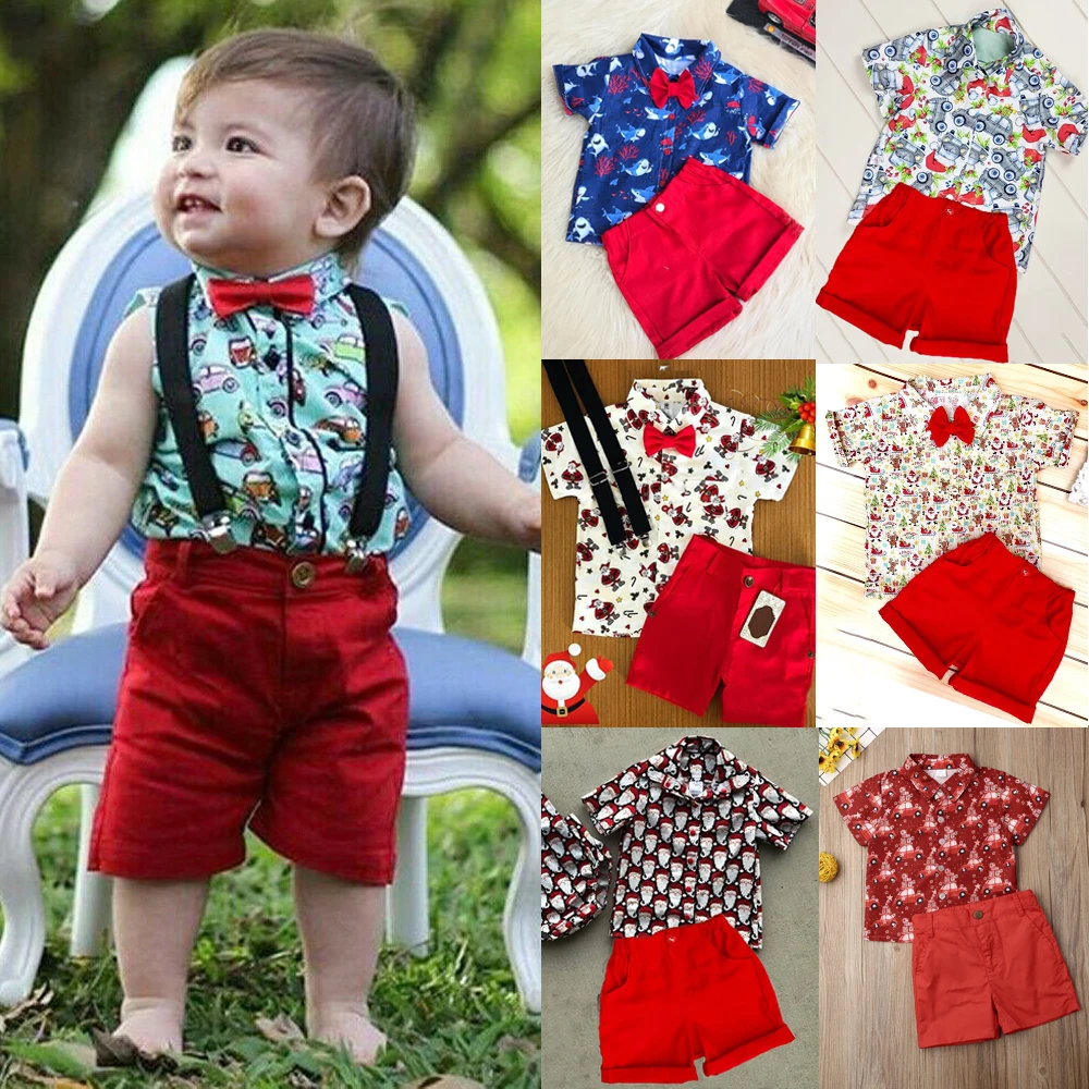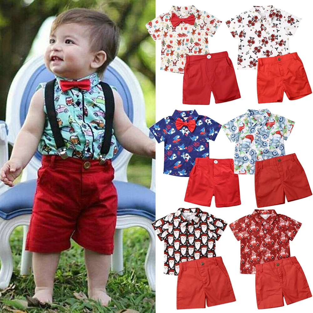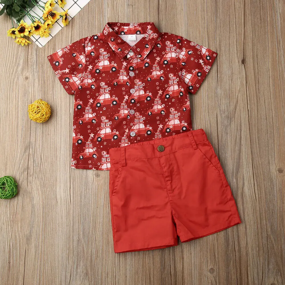 Женский Рождественский комплект одежды для мальчиков, официальный костюм джентльмена для маленьких мальчиков, красная рубашка с мультяшным автомобилем и брюки, рождественские наряды, Новогодняя одежда