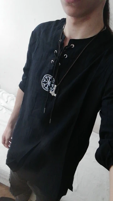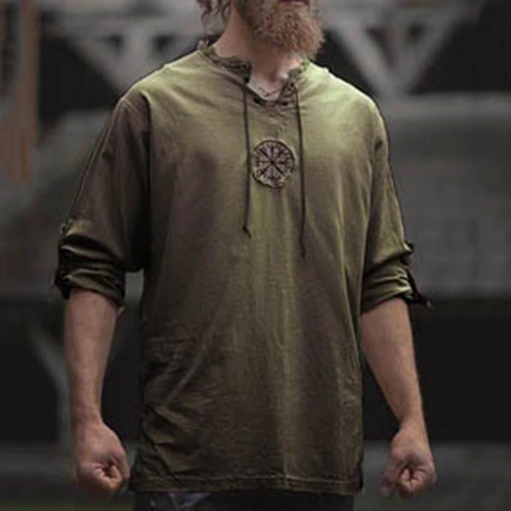Мужская рубашка с длинным рукавом, с вышивкой викингов, на шнуровке, с V-образным вырезом, размера плюс