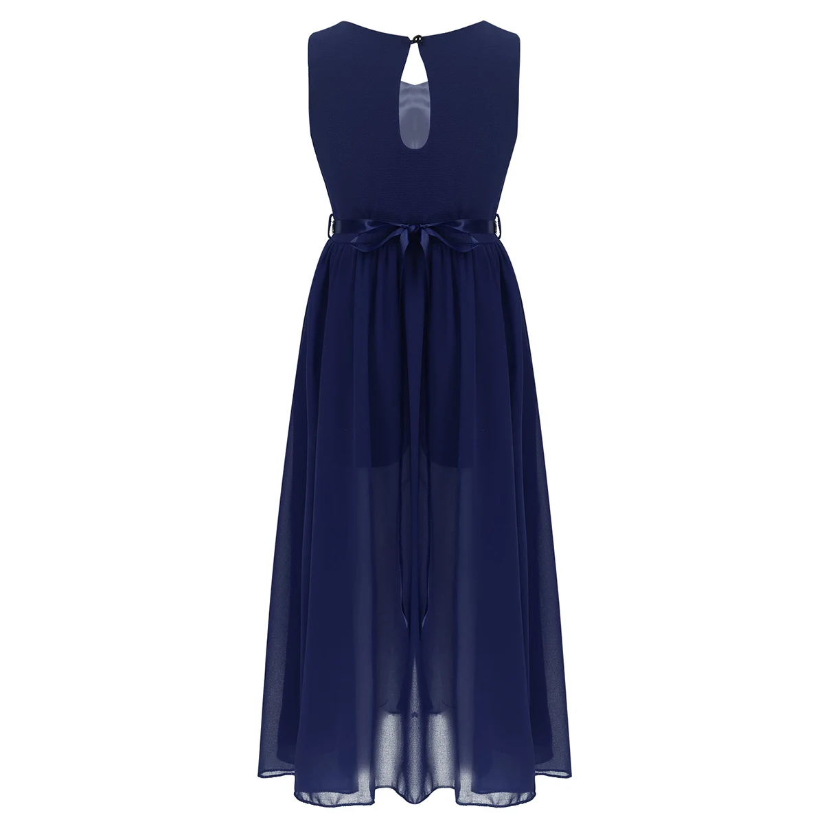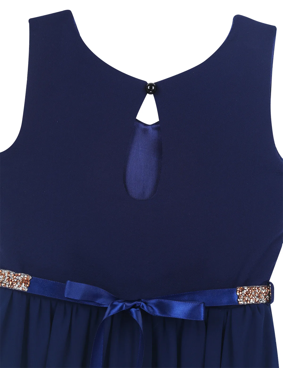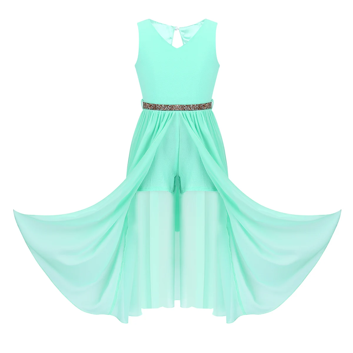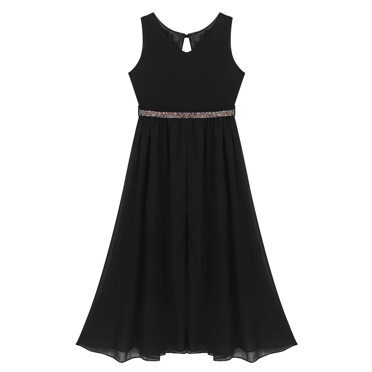 Платье-комбинезон изготовлено из полиэстера и шифона, ручная стирка. Таблица размеров означает возраст для девочек, но только для общего руководства. Без рукавов, с v-образным вырезом и застежкой на пуговицы; Лиф с атласной подкладкой для комфортного ношения. Вырез на спине. Скрытая застежка-молния сбоку. 1 слой Макси-длины с шифоновым наложением крепится вокруг талии. Поставляется с Стразы ремень для завершения установки. В комплект входит: Красивое и стильное платье для вашей девочки. Идеально подходит для школьных танцев, дней рождения, праздников, фотосессий, официальных мероприятий или других особых случаев.