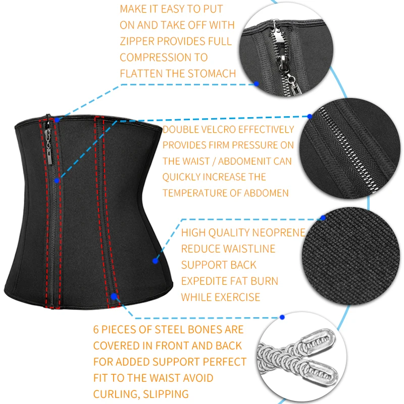 Цвет: черный/серый Размер: S/M/L/XL/2XL/3XL Материал: Корпус: полиэстер 100%; Ядро: Neoprene100 % Применение: фитнес, Йога, бег, тренажерный зал, потеря веса, тренажер для талии Характеристики: мягкий, эластичный, теплоизоляционный, непроницаемый, герметичный Эффект: Вы будете легче потеть в спорте. Дизайн: формируйте животик и определите талию Кости: 6 спиральных стальных костей Преимущество: утягивающие корсеты, ленты для тренировок и даже послеродовой поддержки Специальный: помогает улучшить осанку, контролировать живот Застежка: молния, крючки сверху, застежка-липучка Местоположение склада: Китай, США