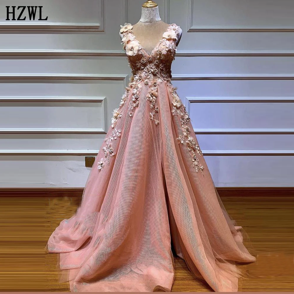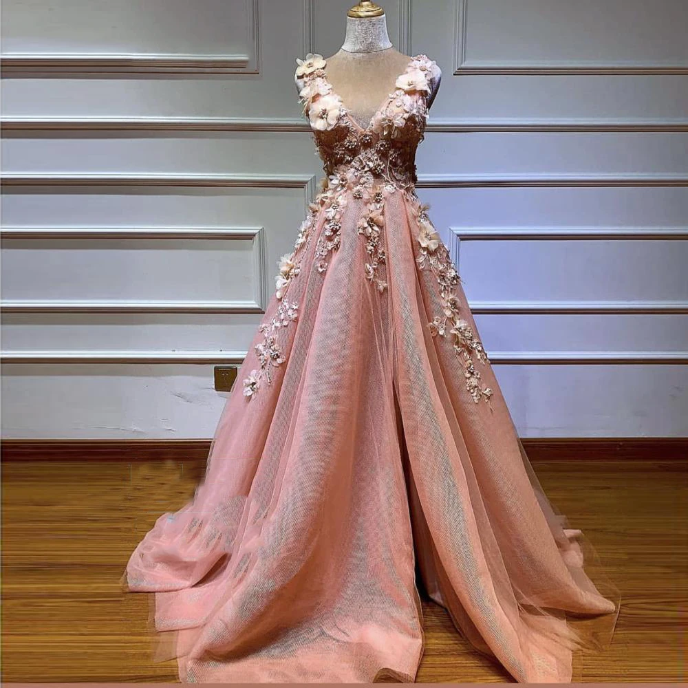 Женское вечернее платье из тюля, элегантное розовое платье с V-образным вырезом, объемными цветами, вышивкой бусинами, разрезом, без рукавов, 2020