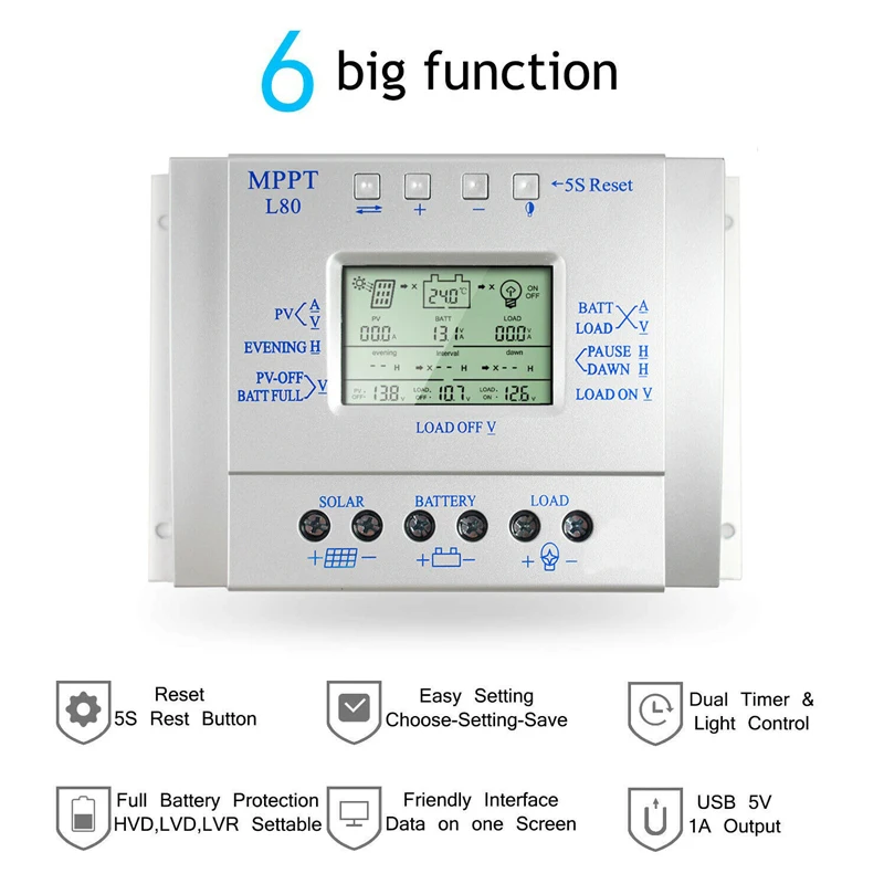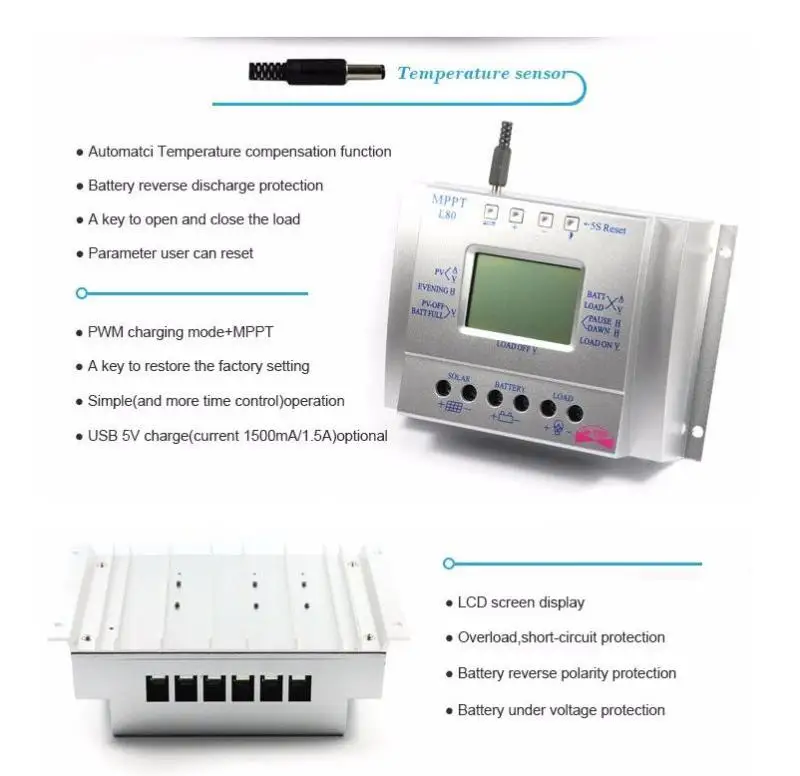 1. ЖК-дисплей 2. Простой интерфейс управления 3. Режим зарядки ШИМ + MPPT 4. Пользователь параметров может сбросить 5. Ключ для открытия и закрытия нагрузки 6. Ключ для восстановления заводских настроек 7. Защита от обратного разряда батареи 8. Защита от обратной полярности аккумулятора 9. Батарея под защитой от перенапряжения 10. Защита от перегрузки, защита от короткого замыкания 11. Автоматическая компенсация температуры функция 12. Может заряжать и разряжать одновременно, всегда держать батарею в полном состоянии