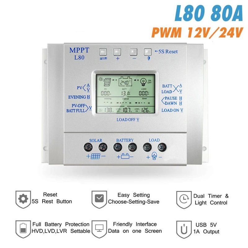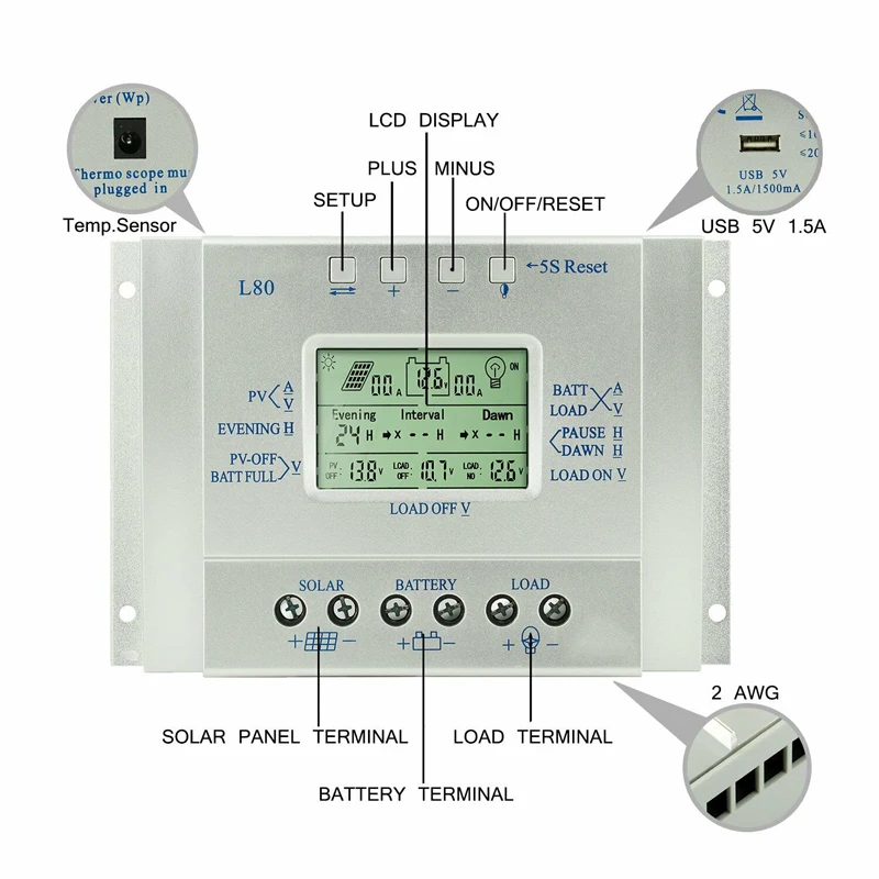 Модель: со слежением за максимальной точкой мощности, L-80 Максимальный ток: 80A Монтажный диаметр провода (мм2): 20мм2 Монтажный провод (AWG): 2 #(AWG) Пиковая мощность панели солнечных батарей (максимальная Wp): 1000W Конфигурация емкости аккумулятора: 800 Ач Размер: 21*14*7,5 см Напряжение поплавка аккумулятора: 13,8 В (система 12 В)/27,6 в (система 24 В) Батарея (Пониженное напряжение) защита: 10,6 В (система 12 В)/21,2 в (система 24 В) Напряжение восстановления батареи (Пониженное напряжение): 10,6 В (система 12 В)/25,2 в (система 24 В) Потеря нагрузки системы: ≤ 13 мА Цикл понижения: ≤ 100 мВ Рабочая температура: -10 °C ~ + 60 °C Температура хранения: -30 °C ~ + 70 °C Рабочая температура: ≤ 90%, без конденсации Компенсация температуры: -4 мВ/ячейка/°C Максимальное напряжение открытой цепи солнечных панелей: 18V ~ 24V (система 12V) 36V ~ 48V (система 24V) Максимальное Напряжение разомкнутой цепи панелей солнечных батарей: ≤ 48V