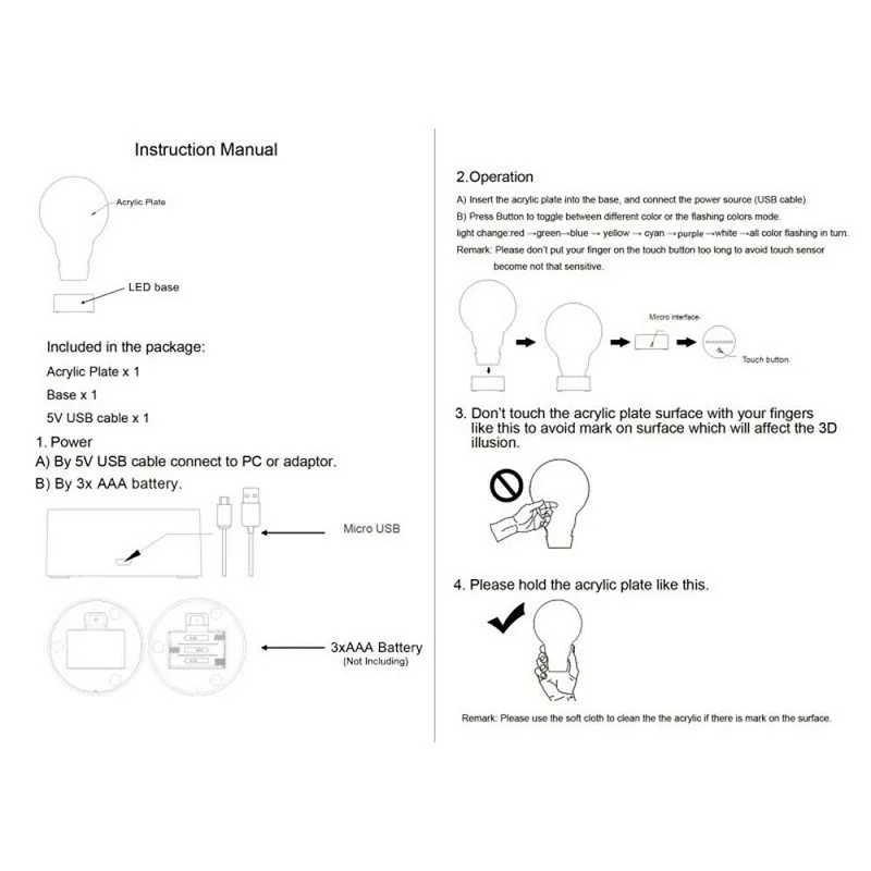 * Этот уникальный и очаровательный светодиодный 3D Визуальный ночной Светильник станет отличным и романтичным подарком для Вашего друга и себяНевероятно, используйте только 2D Акриловый кусок для создания привлекательного 3D стереоскопического визуального узора и световых эффектов, кажется ярким и полным личности, хороший эффект освещения и полный творчества.* Лазерная гравировка акриловых деталей толщиной всего 5 мм, но обеспечивает волшебное 3D освещение, удобное и полезное, простое в использованииНе только объемное стереоскопическое освещение, но и показывает ваш красочный эффект освещения, кнопочный переключатель для управления цветом освещения, семь цветов и один градиентный цвет для выбора просто нажмите кнопку включения на базе ABS.* Высокое качество светодиодный светильник, низкая потребеление энергии, длительный срок службы, подходящие к любому акриловый светильник (направляющая планка осветителя), принесет вам мягкий, но достаточно яркий эффект освещения, не ослепительно и высокой температуры, существует, безопасно для использования.* 7 цветов автоматически изменяет цвет с помощью сенсорного переключателя. Нажмите сенсорную кнопку, чтобы сохранить цвет, затем нажмите его снова, режим автоматического изменения цвета работает.* 16 цветовых режимов с сенсорным кнопочным переключателем и пультом дистанционного управления. Может управлять светильник как с помощью сенсорной кнопки, так и с помощью пульта дистанционного управления.